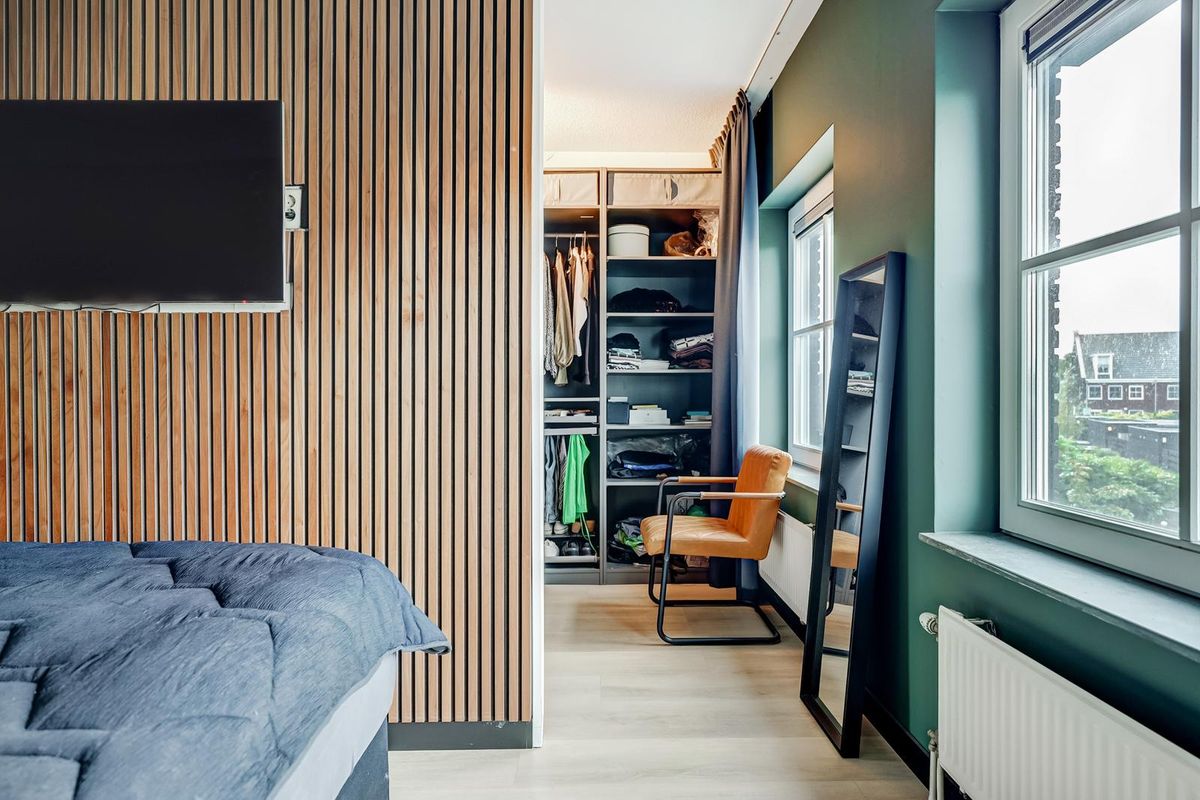 Aan de achterzijde vindt je de riante, L-vormige, derde (vierde) slaapkamer die is voorzien van een brede kunststof dakkapel. De slaapkamer heeft zeil als vloerafwerking, wanden met renovlies en knieschotten (extra bergruimte onder de schuine kap).