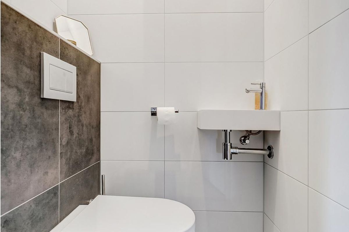 Moderne, geheel in een grijs-witte kleurstelling betegelde toiletruimte (2018), welke is voorzien van een fontein en een hangend toilet.