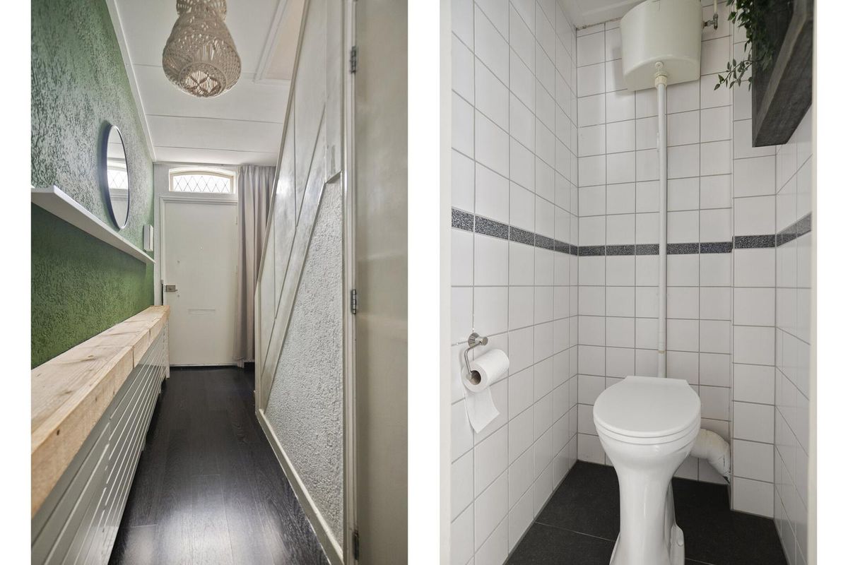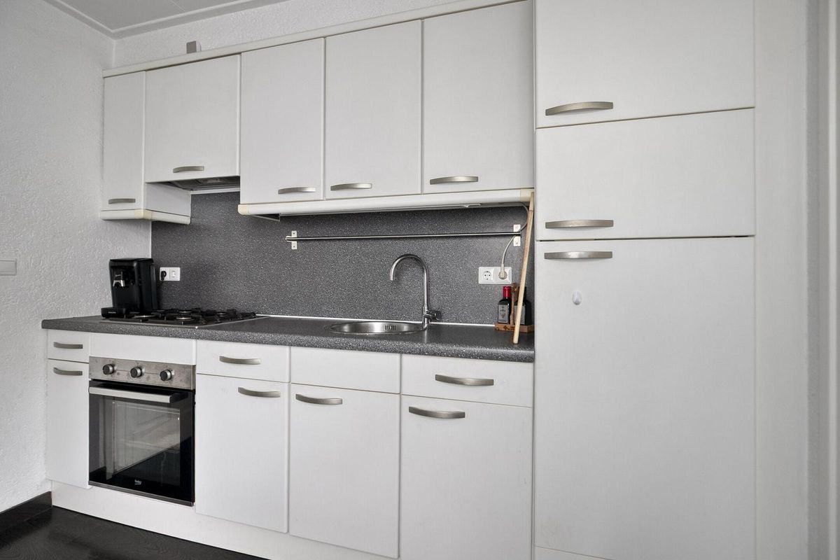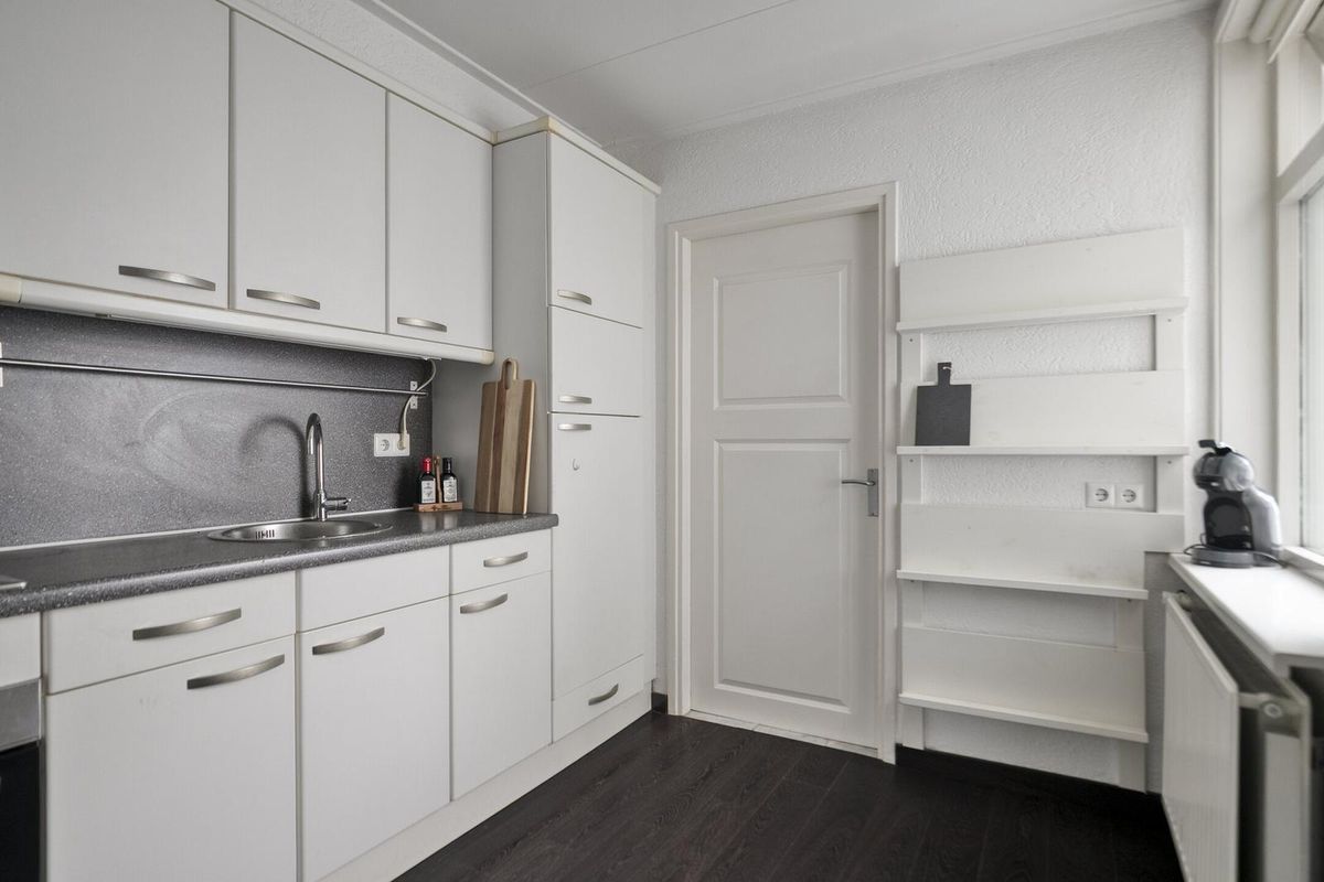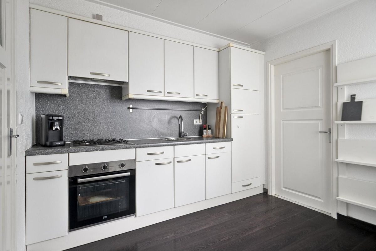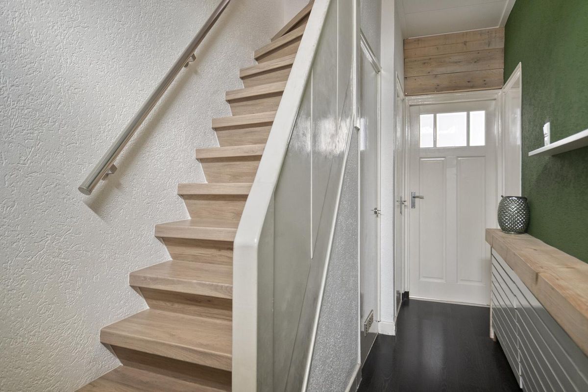 Binnen valt meteen de lichtinval in de doorzonwoonkamer op. De woonkamer met donkere laminaatvloer loopt door naar de keuken, waar een 4-pits gasfornuis, oven en koelkast klaarstaan. Aansluitend is er een praktische bijkeuken voor de wasmachine, droger en cv-ketel, met een deur naar het terras en de tuin. De trap in de entreehal is netjes gerenoveerd en verdeelt de ruimte subtiel, waardoor alles luchtig en ruimtelijk blijft.