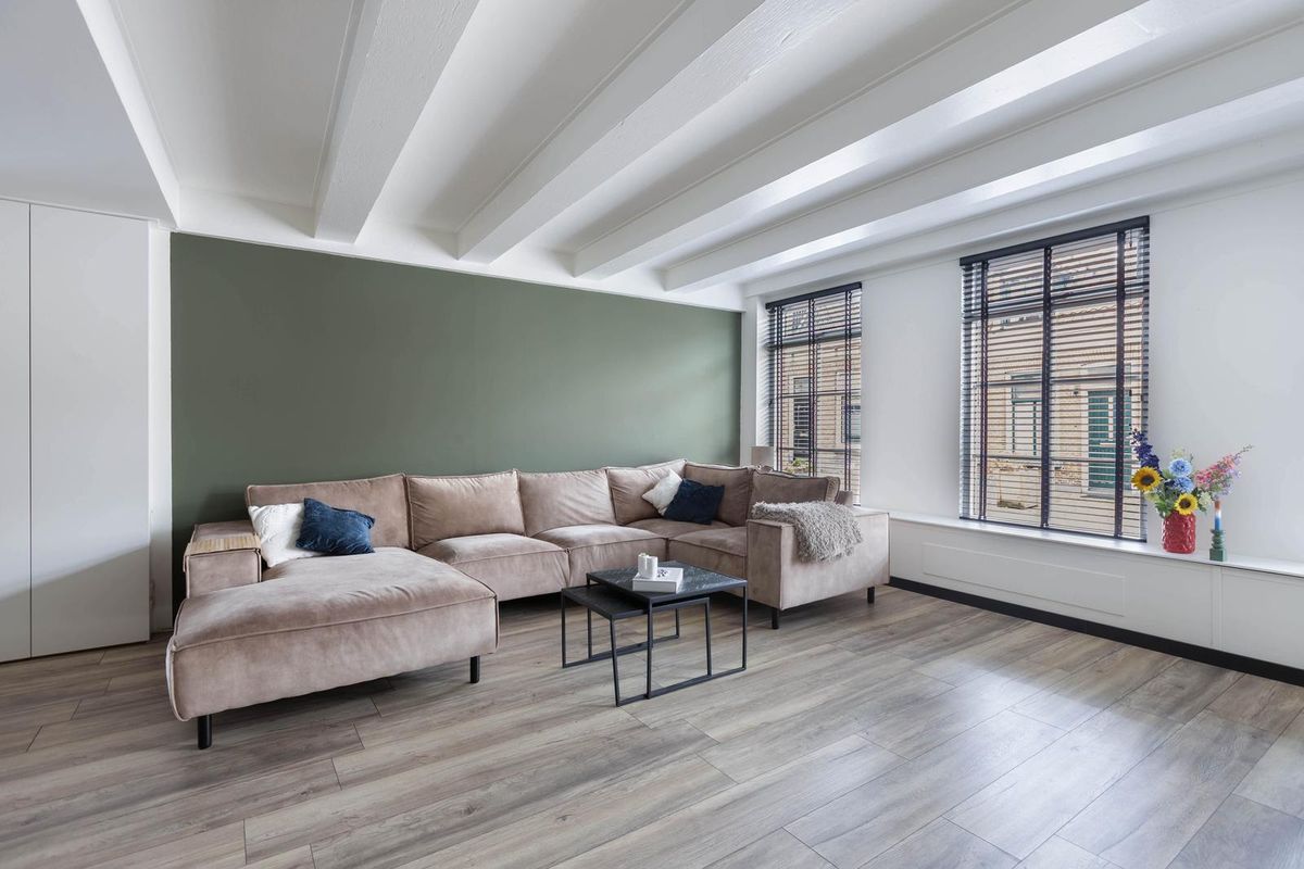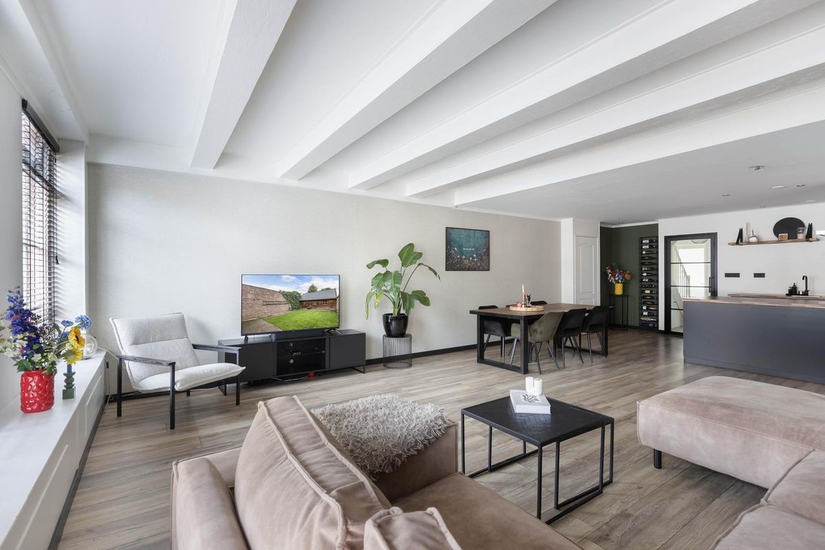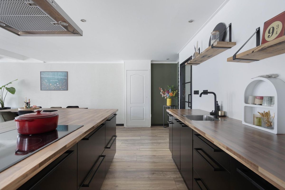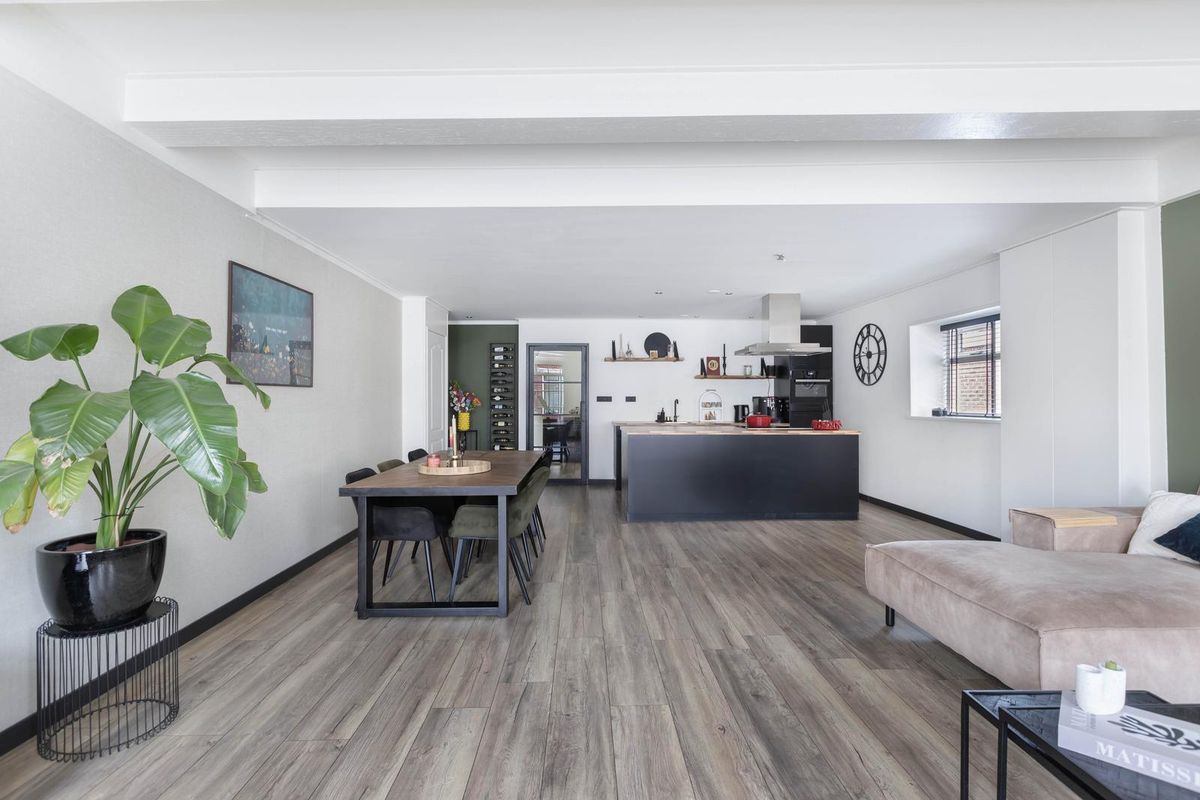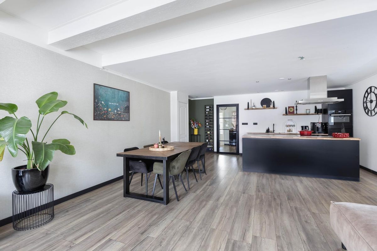 De royale en verrassend lichte woonkamer bestaat uit een zitgedeelte, eethoek en open keuken. De keuken is in 2016 vernieuwd en voorzien van een kookeiland met inductiekookplaat, afzuigkap, vaatwasser, veel bergruimte en is recent professioneel gespoten. De gehele begane grond is voorzien van een laminaatvloer met comfortabele vloerverwarming.