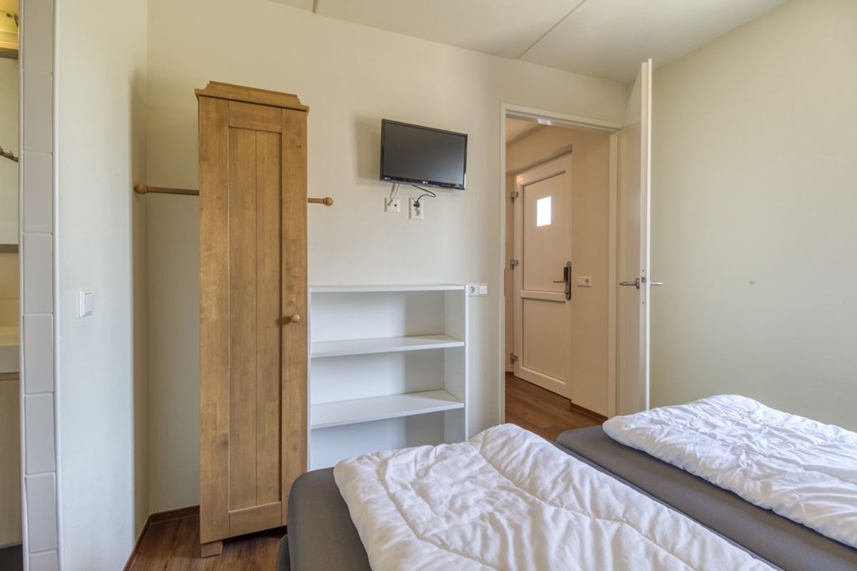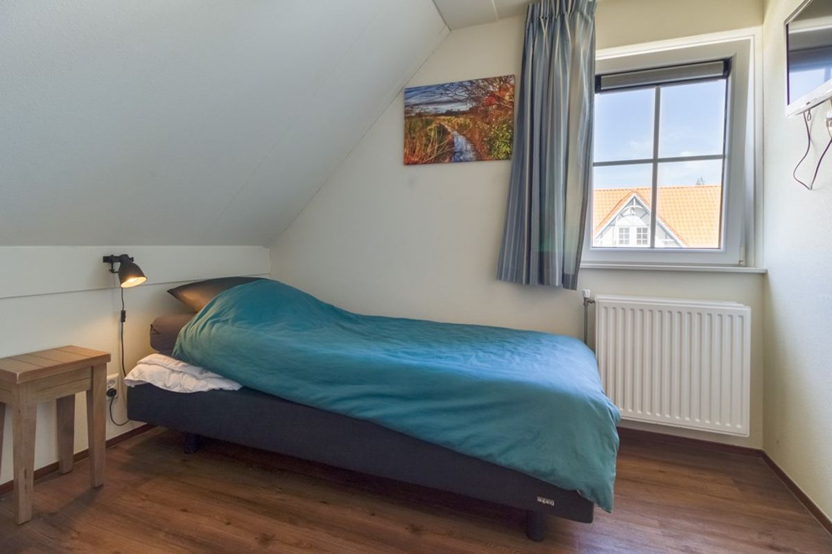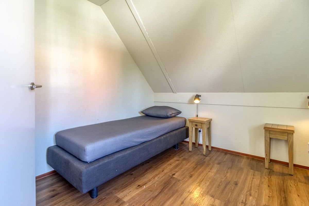 Aangrenzend aan de keuken is er een bijkeuken/berging. Hier hangt de verwarmingsketel, is er een wasmachine-aansluiting en een buitendeur die uitkomt aan de zijkant van de woning. De berging is voldoende groot voor het opbergen van huishoudelijke spullen. De slaapkamer op de begane grond beschikt over een tweepersoonsbed, een eigen TV en een badkamer ensuite.
