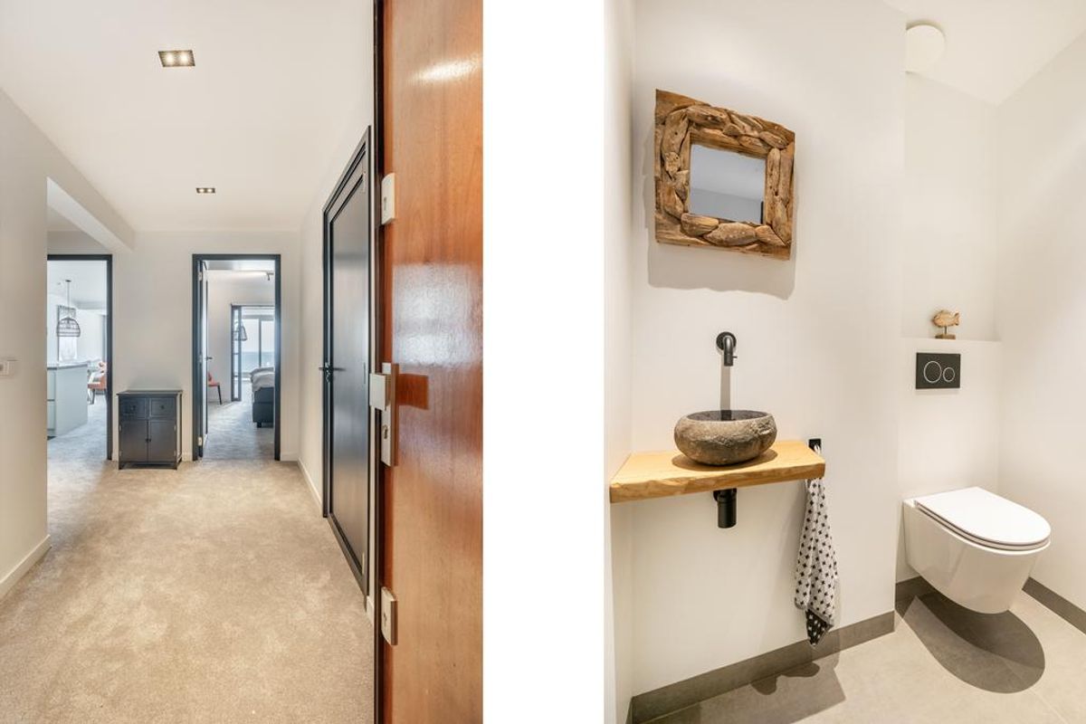 Entree, hal met videofooninstallatie en garderobe. Aparte toiletruimte met vrijdragend toilet en fontein. Badkamer met inloop (regen)douche en wastafelmeubel met spiegel en verlichting. Ruime slaapkamer met vaste kasten. 2e slaapkamer met stapelbed. Berging met wasmachine en droger.