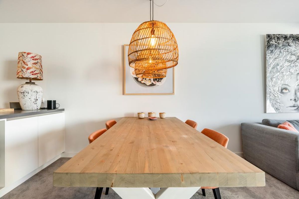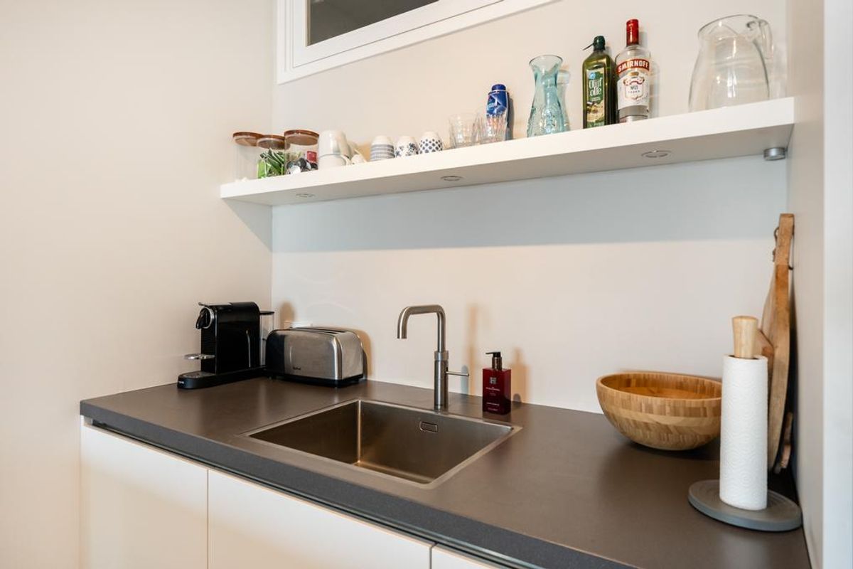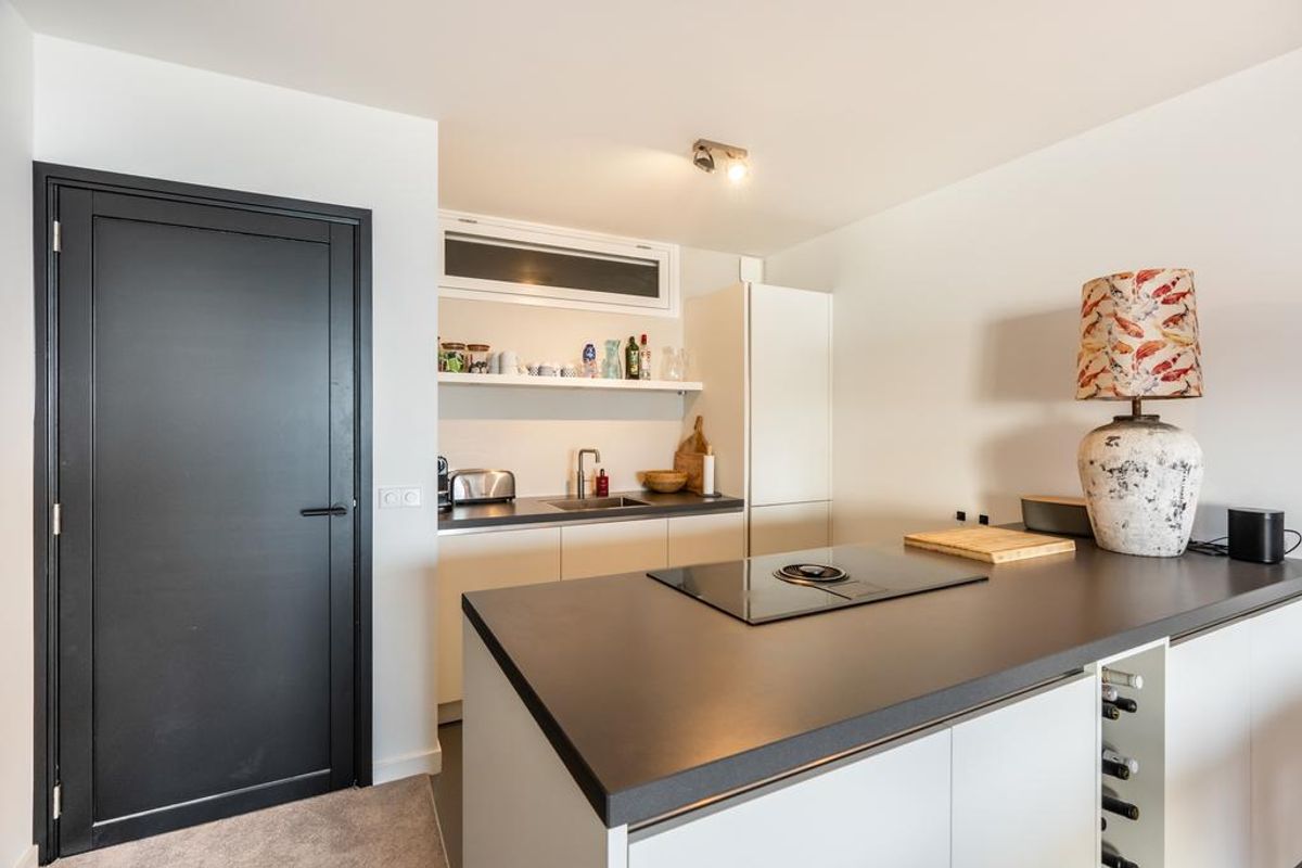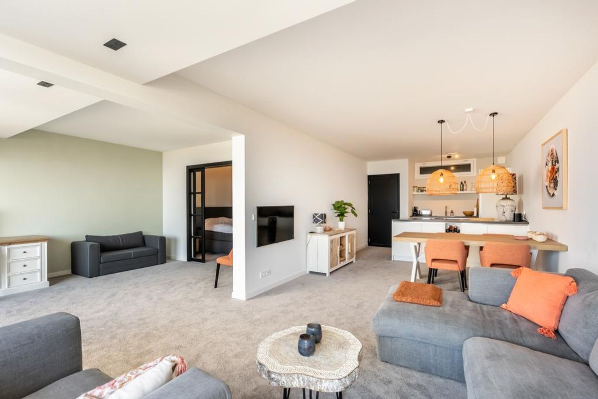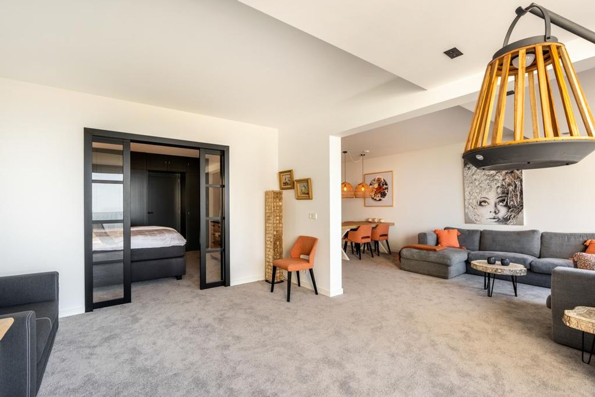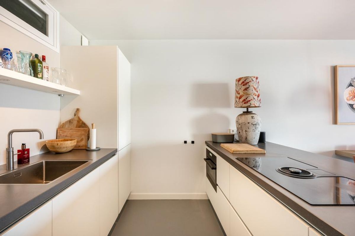 Luxe keuken met kookeiland en o.a. voorzien van inductie kookplaat met ingebouwde afzuiger, vaatwasser, combi-oven, koel-vriescombinatie, Quooker, etc. L-vormige woonkamer met dubbele schuifpui naar het ruime zonnige terras van ca. 24 m2.