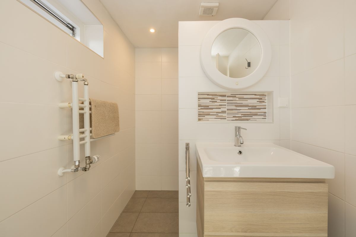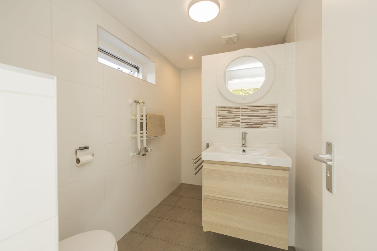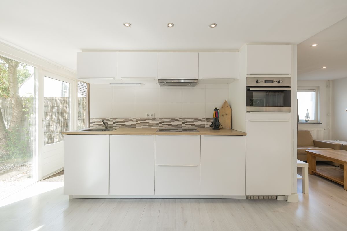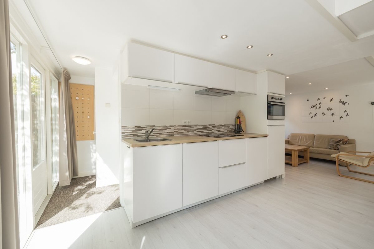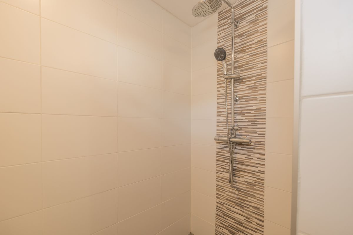 Entree, hal met de meterkast en de toegang naar de volledig en smaakvol betegelde badkamer met een wandcloset, mechanische ventilatie, een wastafelmeubel en een inloopdouche met een heerlijke regendouche. De fraaie en in lichte kleuren uitgevoerde keuken is voorzien van sfeerverlichting en diverse inbouwapparatuur zoals inductiekookplaat met afzuigkap, een vaatwasser, een koelkast, een combimagnetron en een wasmachine. De woonkamer is aangenaam licht door de grote raampartijen en heeft een bio-ethanol haard en een lichte laminaatvloer.