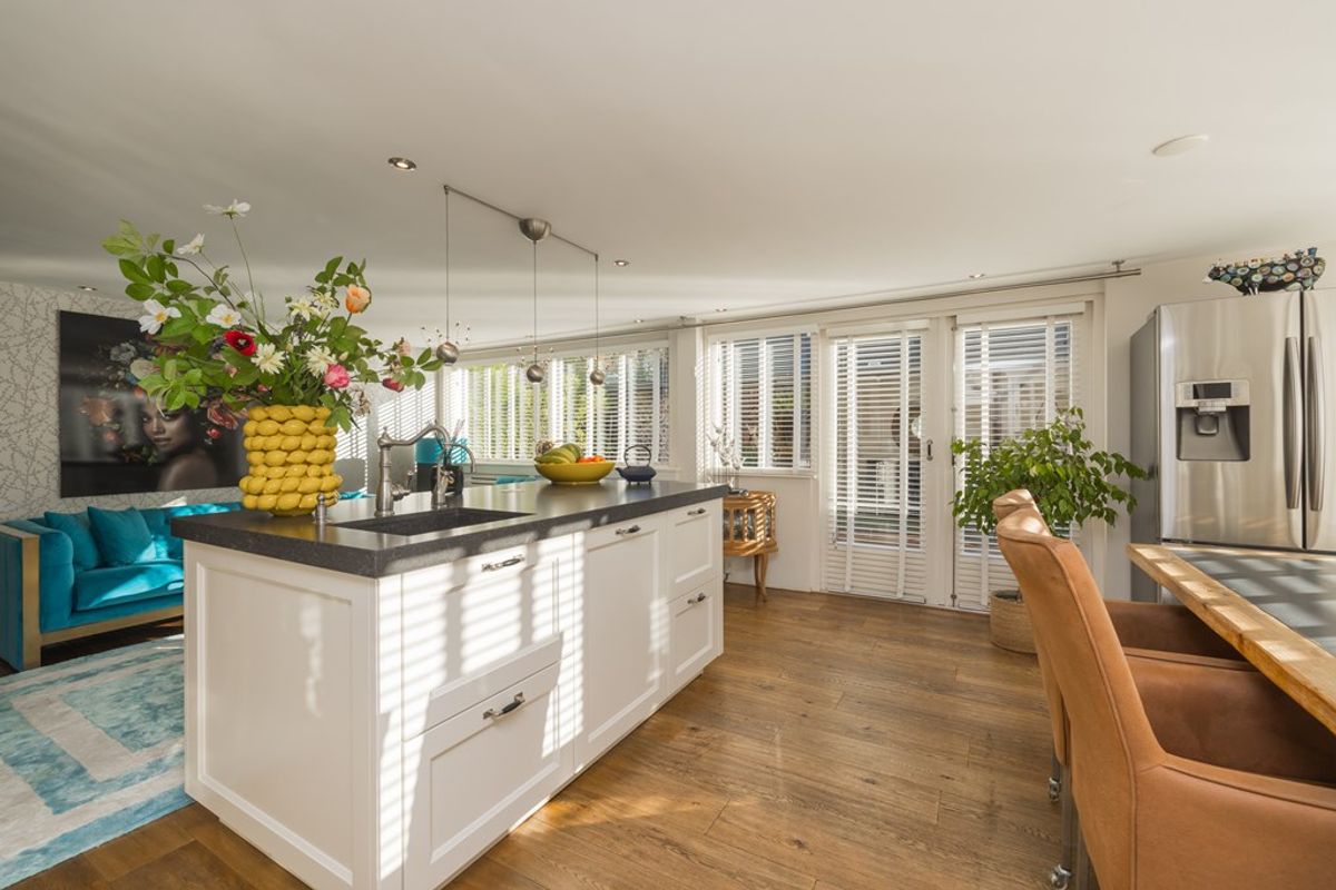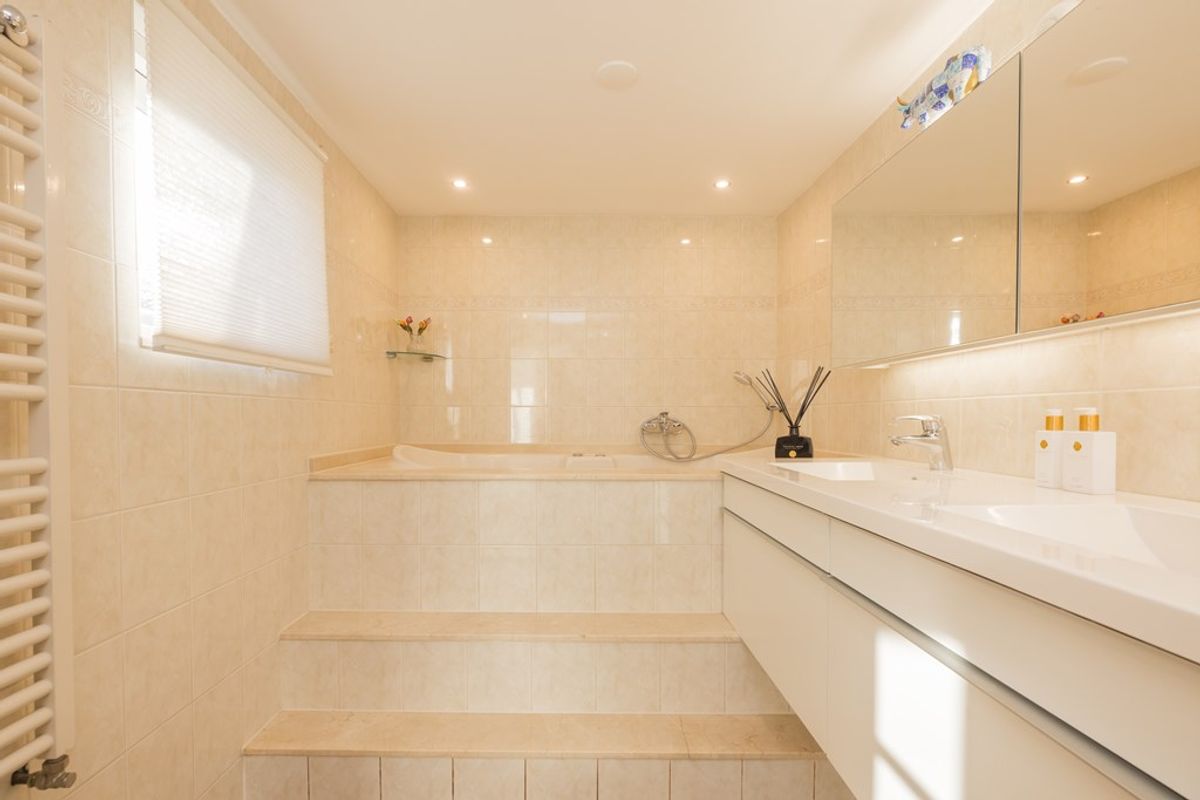 Entree, hal met de meterkast en de toiletruimte met een fonteintje en ventilatie. In de uitbouw bevindt zich de prachtige badkamer met een halfronde douchcabine, ingebouwde verlichting, een dubbel wastafelmeubel en een verhoogd gelegen en zeer luxueus ligbad. De woonkamer en de eetkeuken zijn uitermate sfeervol, het is werkelijk een lust voor het oog! De in lichte kleur uitgevoerde en met de hand gemaakte keuken heeft een prachtig keukenblad van Belgische natuursteen en diverse inbouwapparatuur zoals een 4-pits gasfornuis (Falcon) met een wok brander met daaronder 3 ovens. Er is een keukeneiland met de vaatwasser (Miele), veel extra kastruimte, een spoelbak en een Quooker kraan. Er staat een losse koel/vries combinatie deze kan worden overgenomen. Via de openslaande deuren is de keurig verzorgde tuin te bereiken. De woonkamer heeft een fraaie houten vloer en ingebouwde sfeerverlichting, via de woonkamer is de kast onder de trap bereikbaar met de opstelling van de wasmachine.