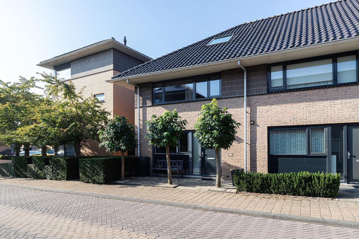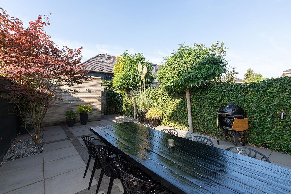De tuin is met zorg aangelegd en ademt rust en stijl. De voortuin oogt verzorgd, met drie leibomen die voor natuurlijke schaduw zorgen. De achtertuin, gesitueerd op het zuidwesten, is smaakvol ingericht met een groot terras, moderne lijnen, groene beplanting en een fraai begroeide schutting. Achterin de tuin bevindt zich een houten berging met elektra en een praktische achterom. Aan de achtergevel zorgt een zonnescherm voor extra comfort tijdens zonnige dagen.
