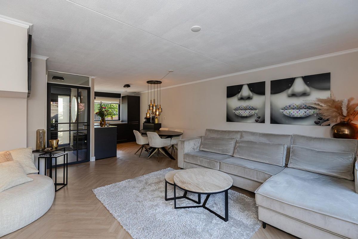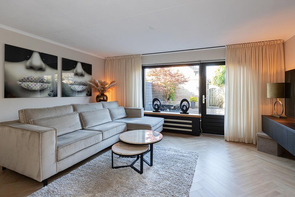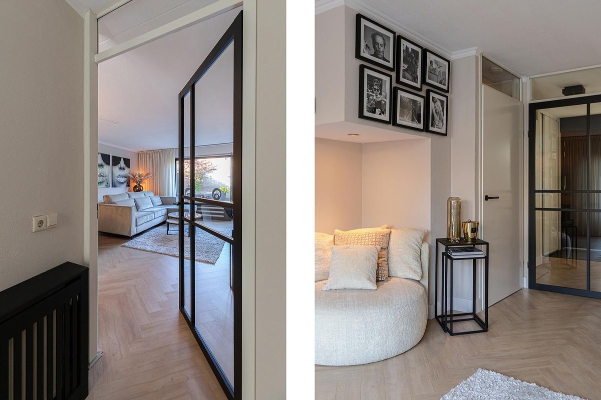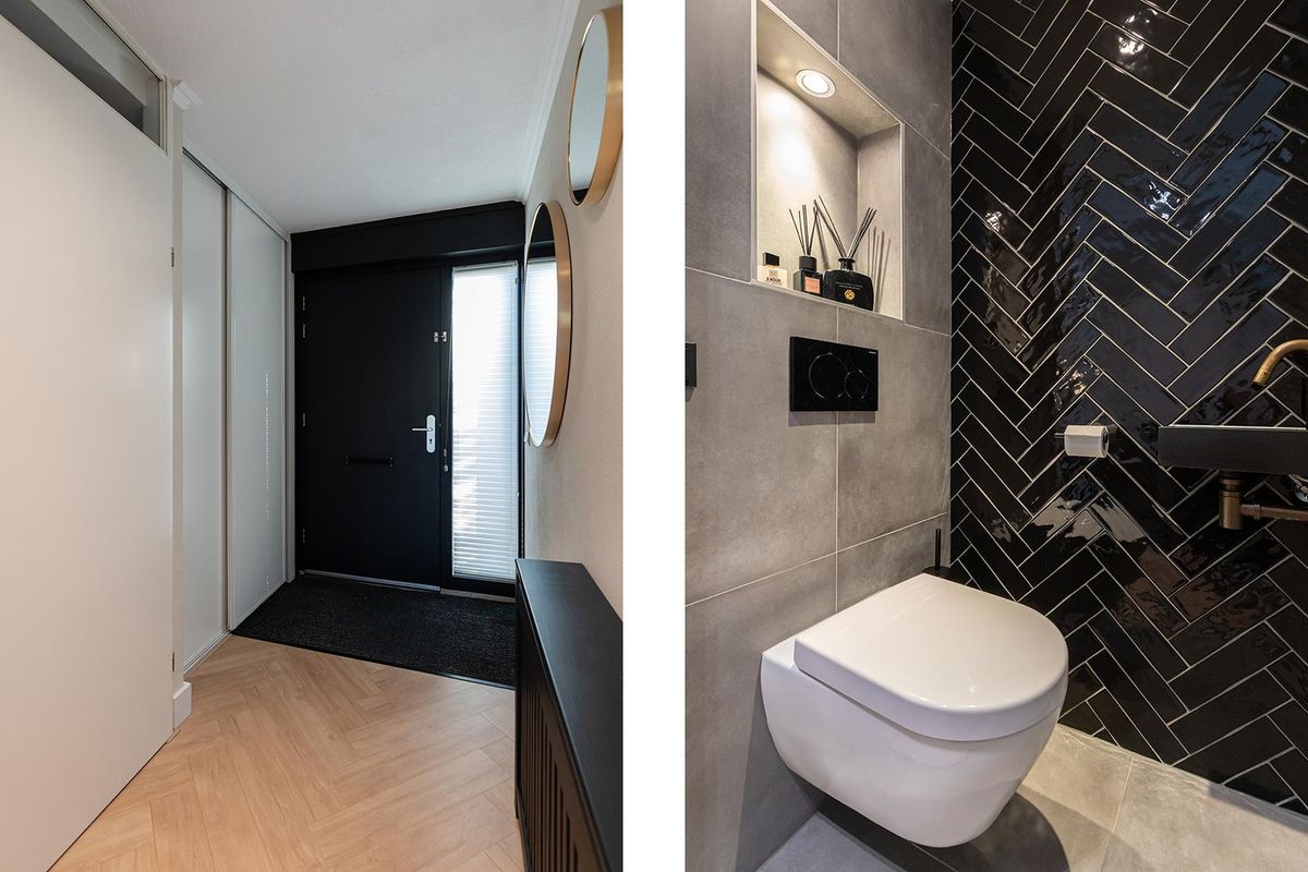 Bij binnenkomst valt direct de verzorgde afwerking op. De hal vormt een mooie binnenkomer met toegang tot het moderne toilet, de meterkast en de trapopgang. De zwarte glazen deur naar de woonkamer geeft alvast een voorproefje van de eigentijdse stijl die je verder in de woning terugziet. Op de begane grond ligt een fraaie laminaatvloer in visgraatmotief die het geheel een luxe uitstraling geeft. De woonkamer voelt ruim en licht aan, met een openslaande deur naar de tuin en een praktische trapkast voor extra opbergruimte.