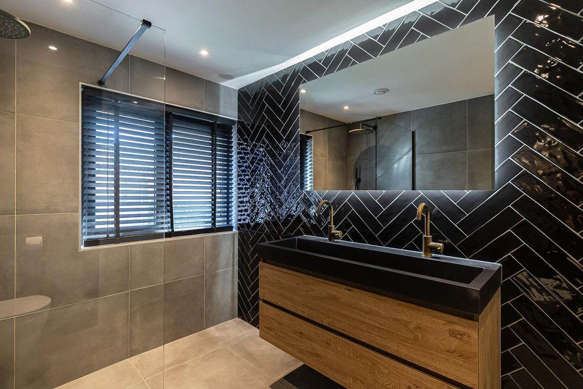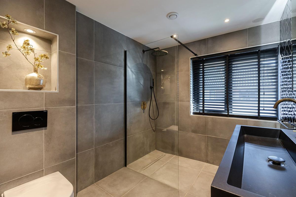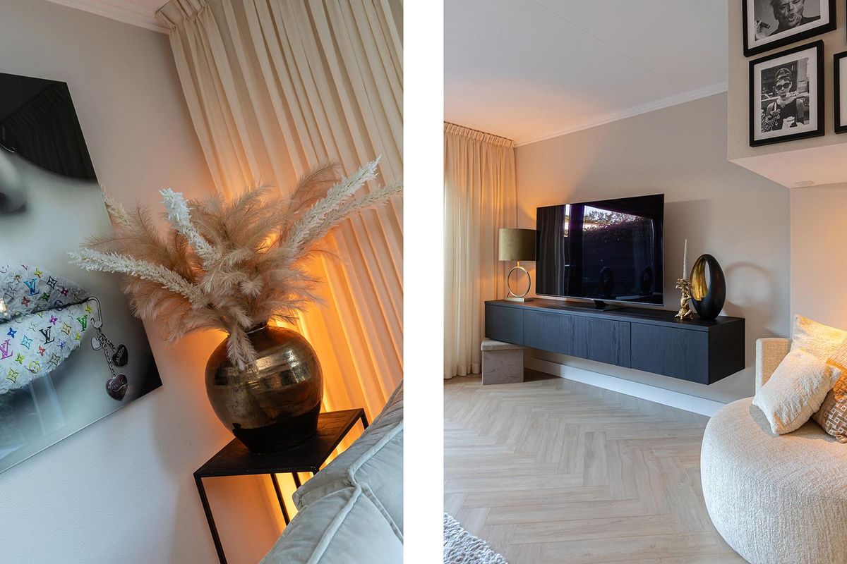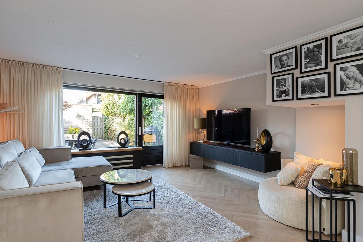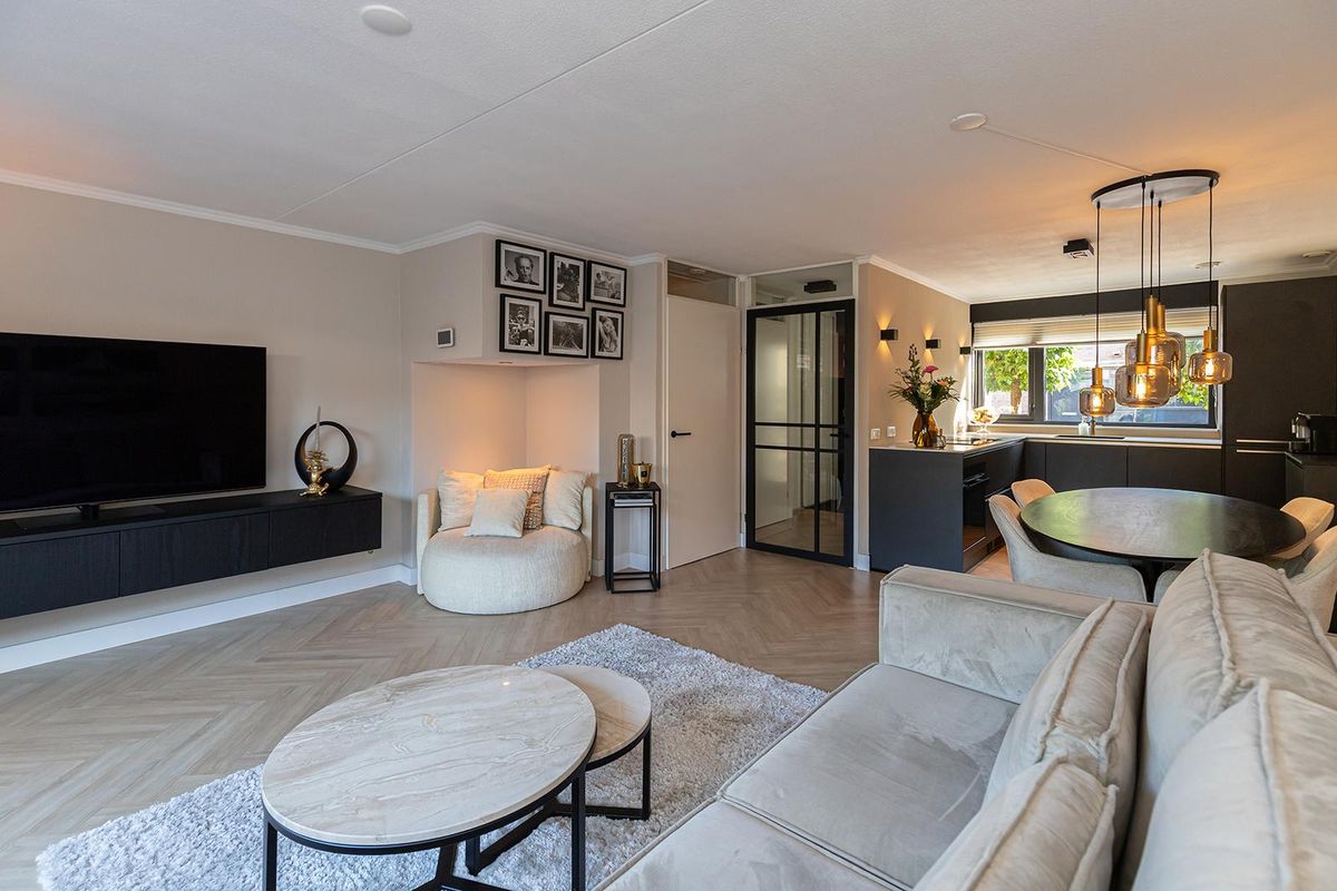 Bij binnenkomst valt direct de verzorgde afwerking op. De hal vormt een mooie binnenkomer met toegang tot het moderne toilet, de meterkast en de trapopgang. De zwarte glazen deur naar de woonkamer geeft alvast een voorproefje van de eigentijdse stijl die je verder in de woning terugziet. Op de begane grond ligt een fraaie laminaatvloer in visgraatmotief die het geheel een luxe uitstraling geeft. De woonkamer voelt ruim en licht aan, met een openslaande deur naar de tuin en een praktische trapkast voor extra opbergruimte.