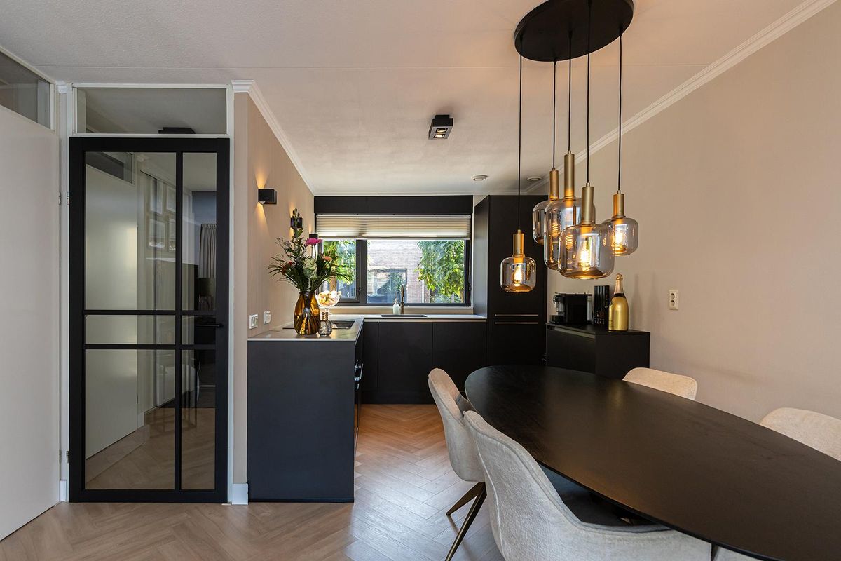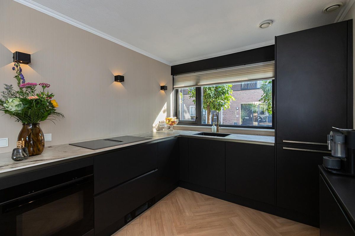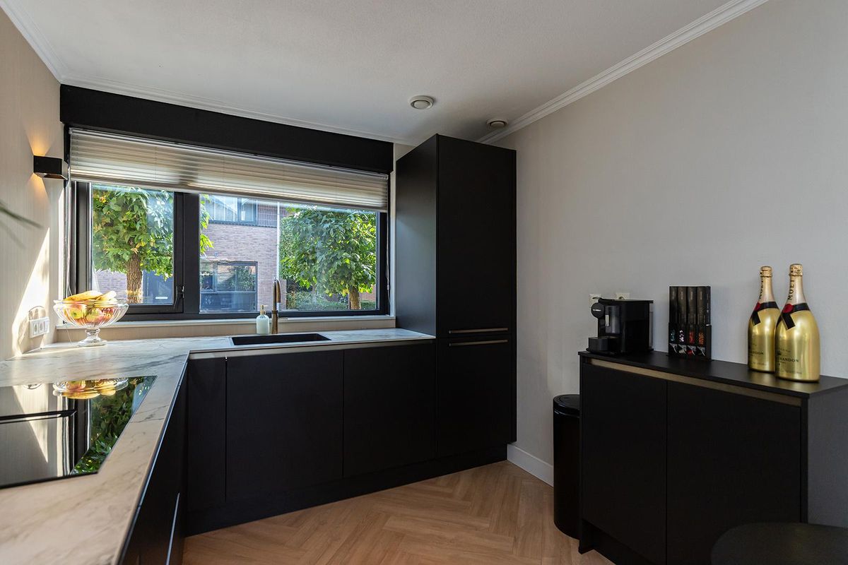 Aan de voorzijde ligt de moderne open keuken (2023), uitgevoerd in stijlvol zwart met een licht keramisch werkblad. De keuken is volledig uitgerust met een inductiekookplaat met geïntegreerde afzuiging, combimagnetron, vaatwasser, koel-vriescombinatie, Quooker en een extra koffiecorner. Het ontbreken van bovenkastjes zorgt voor een ruimtelijk effect, terwijl het zicht op de straat en voortuin zorgt voor een prettige verbinding met de omgeving.