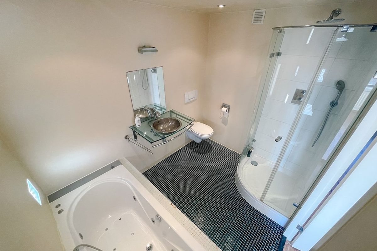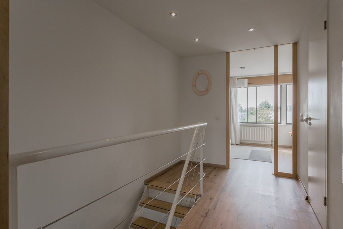 A staircase from the living room leads to a spacious landing with two bedrooms — one at the rear, one at the front — and a well-equipped bathroom with a bath, walk-in shower, a second toilet, and a sink with mirror. A built-in storage room on the landing houses the central heating boiler, mechanical ventilation, and washing machine/dryer connections.