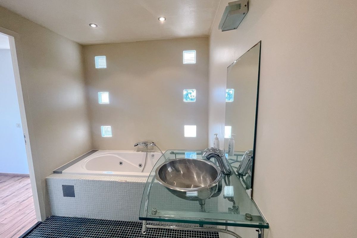 The apartment has a modern entrance with an intercom system, a separate toilet with hand basin, and a welcoming hallway that connects all rooms. The living room is large and very bright, with big windows and sliding doors that open onto your own 21 m² private terrace. The terrace faces southwest — which means sunshine in the afternoon and evening. The kitchen is at the front of the apartment, with a window that looks out over the water feature outside.