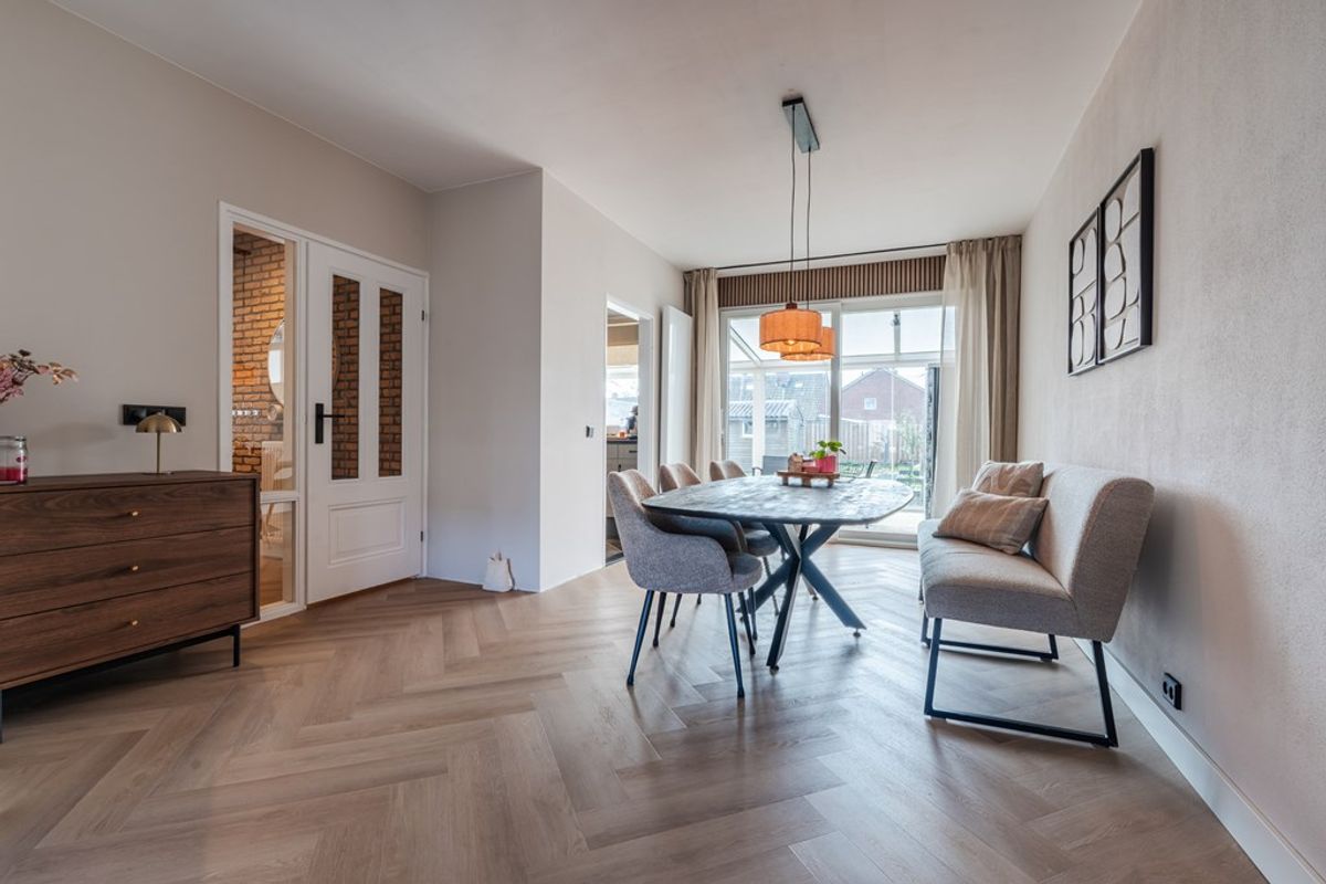- Zeer ruime, lichte woonkamer voorzien van een visgraad PVC vloer, open haard, airco en schuifpui naar de serre