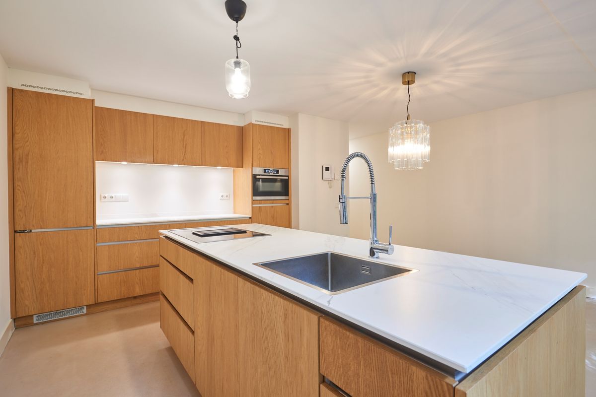 De maatwerk keuken heeft Bosch apparatuur, waaronder een inductiekookplaat met Bora-afzuiging, koel-vries combinatie, vaatwasser en combi-oven/magnetron. Er ligt een gietvloer op deze verdieping.