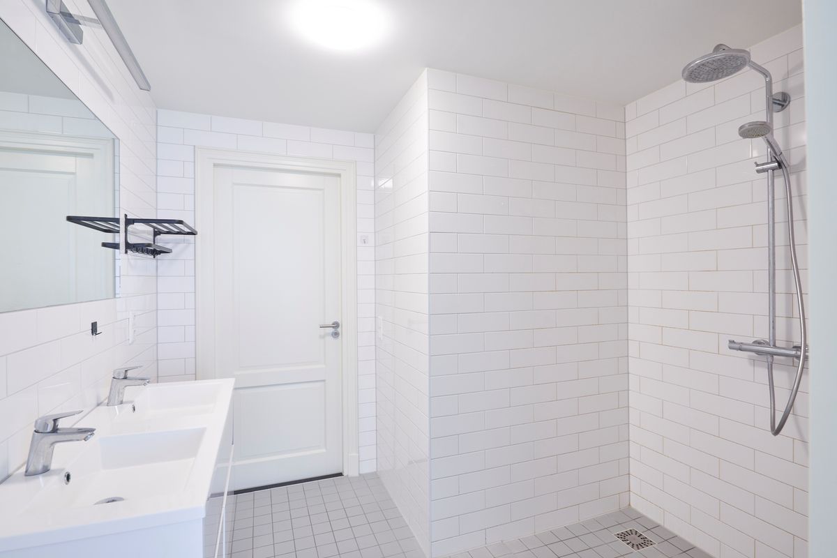 De twee kamers op de begane grond zijn met elkaar verbonden door een ruime badkamer met inloopdouche en dubbele wastafel. Aan de gang ten slotte, vindt u ook nog een toiletruimte en de kast van de cv-ketel. De hele verdieping is voorzien van een massief houten vloer.