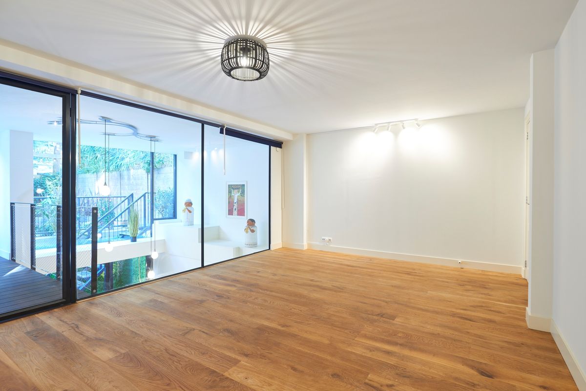 On the ground floor, immediately to the left upon entering, is a spacious bedroom facing the street. Walking straight down the hallway, you reach an even larger bedroom, which can also serve as an office, playroom, or second living room. A convenient corridor connects this room to the beautifully landscaped, south-facing garden.