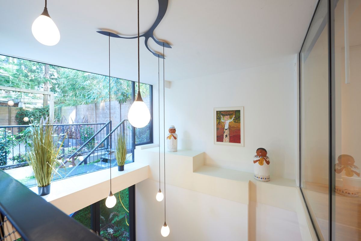 De living met open keuken is aan de tuinzijde. Het meer dan 5 meter hoge plafond, waar een bijzonder handgemaakte lamp hangt, en de open corridor naar de tuin zorgen hier voor een loft-style gevoel.
