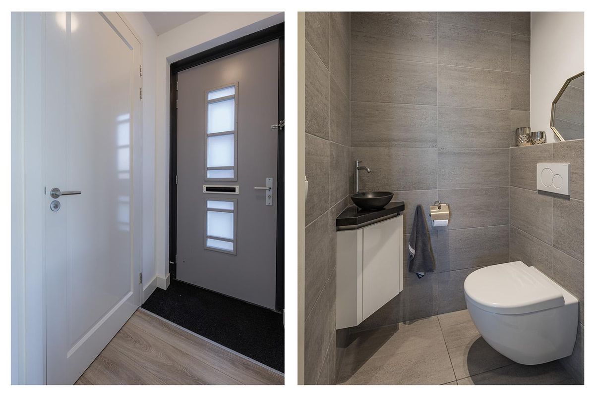 Entree met garderoberuimte, meterkast met 8 elektrische groepen en een krachtstroomgroep. Betegelde toiletruimte met inbouwcloset en fonteintje.