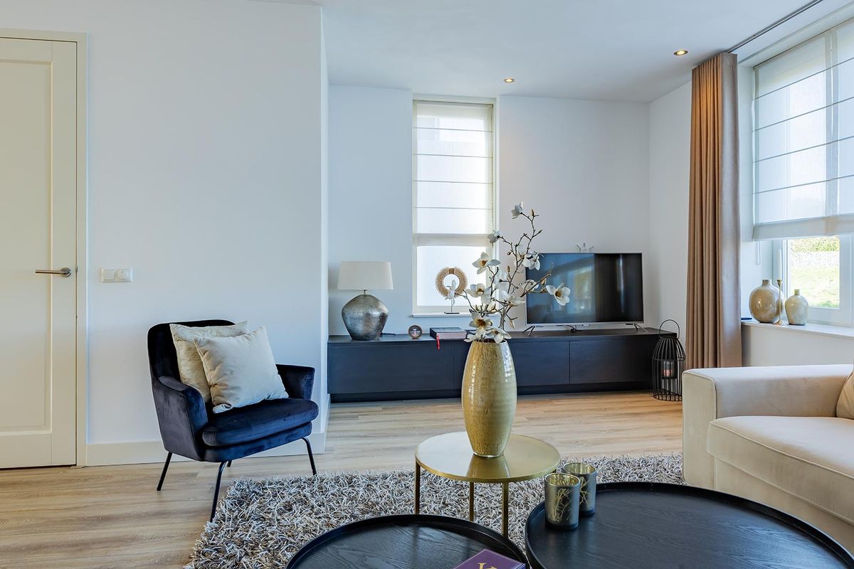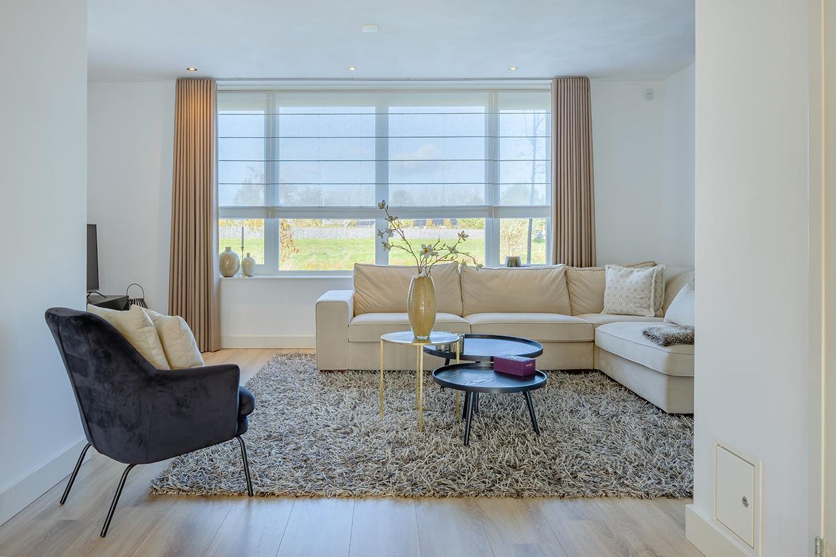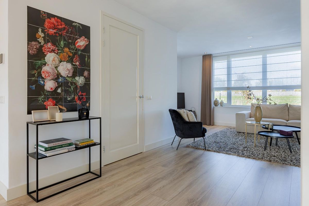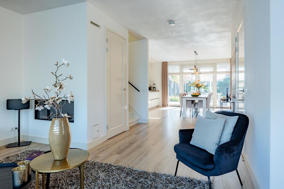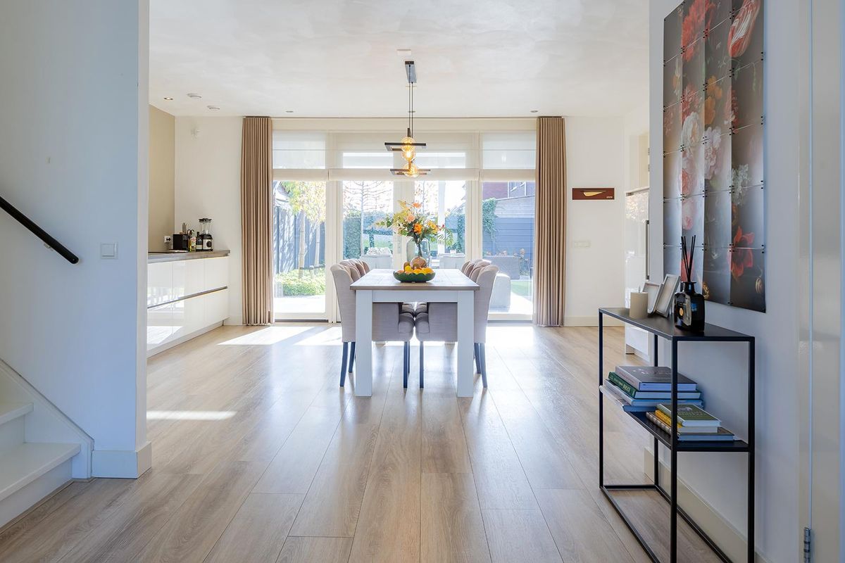 Ruime, gezellige woonkamer met gashaard en een mooie lichte laminaatvloer (doorgelegd op de gehele begane grond) voorzien van vloerverwarming. De tv/zit-kamer is aan de voorzijde van de woning en heeft een mooi blijvend vrij uitzicht over een groenstrook. De wanden zijn voorzien van stucwerk met een hele fijne korrel en het plafond is voorzien van stucwerk met inbouwspots.