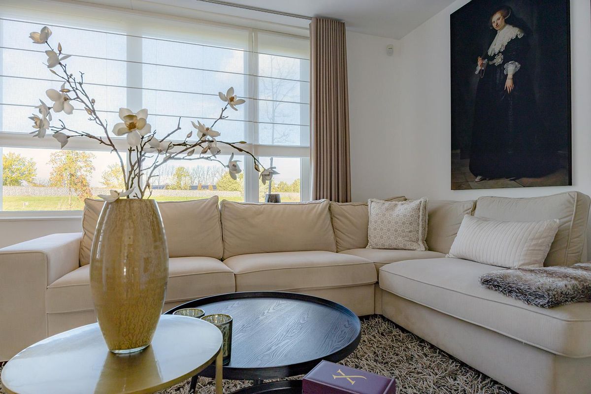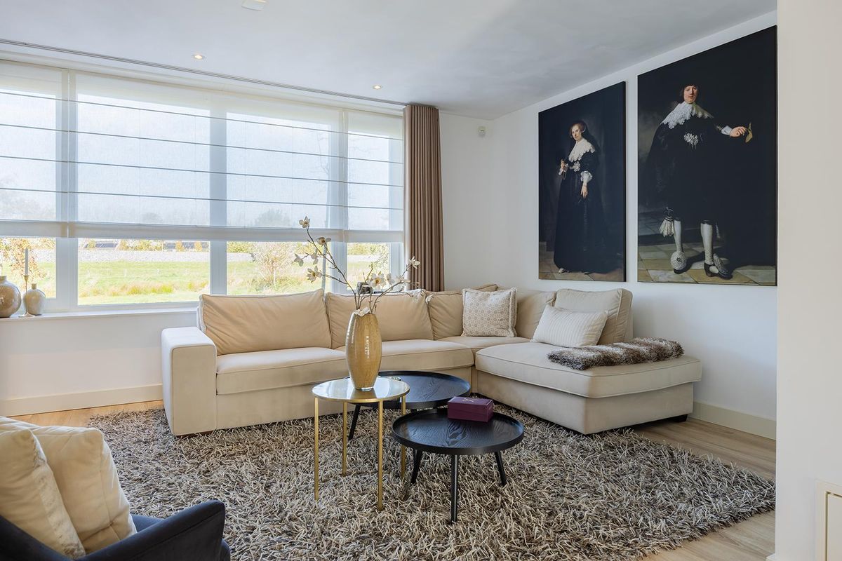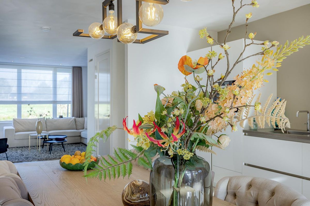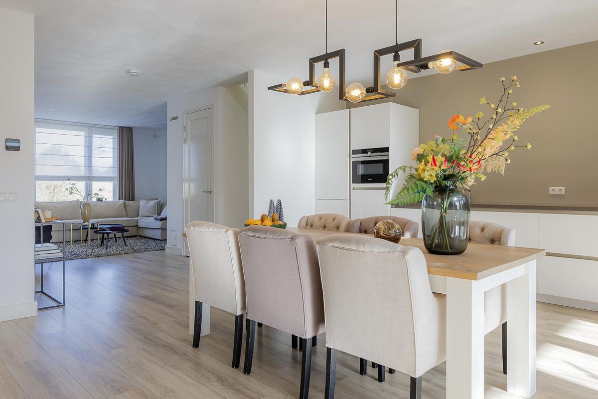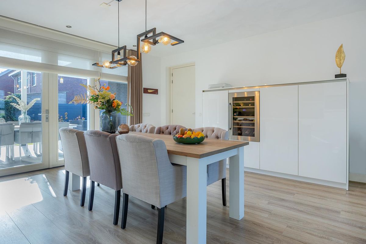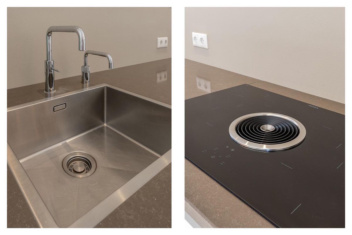 De prachtige open woonkeuken is voorzien van een moderne witte hoogglans keukeninrichting met zandkleurig composiet werkblad met rvs spoelbak en diverse apparatuur zoals: vaatwasmachine, combi oven/magnetron, inductiekookplaat met geïntegreerde afzuigkap, quooker, wijnklimaatkast en koelkast.
