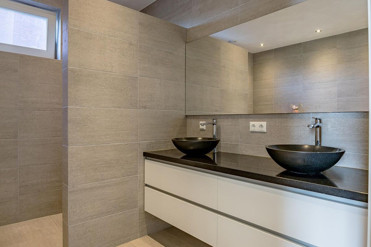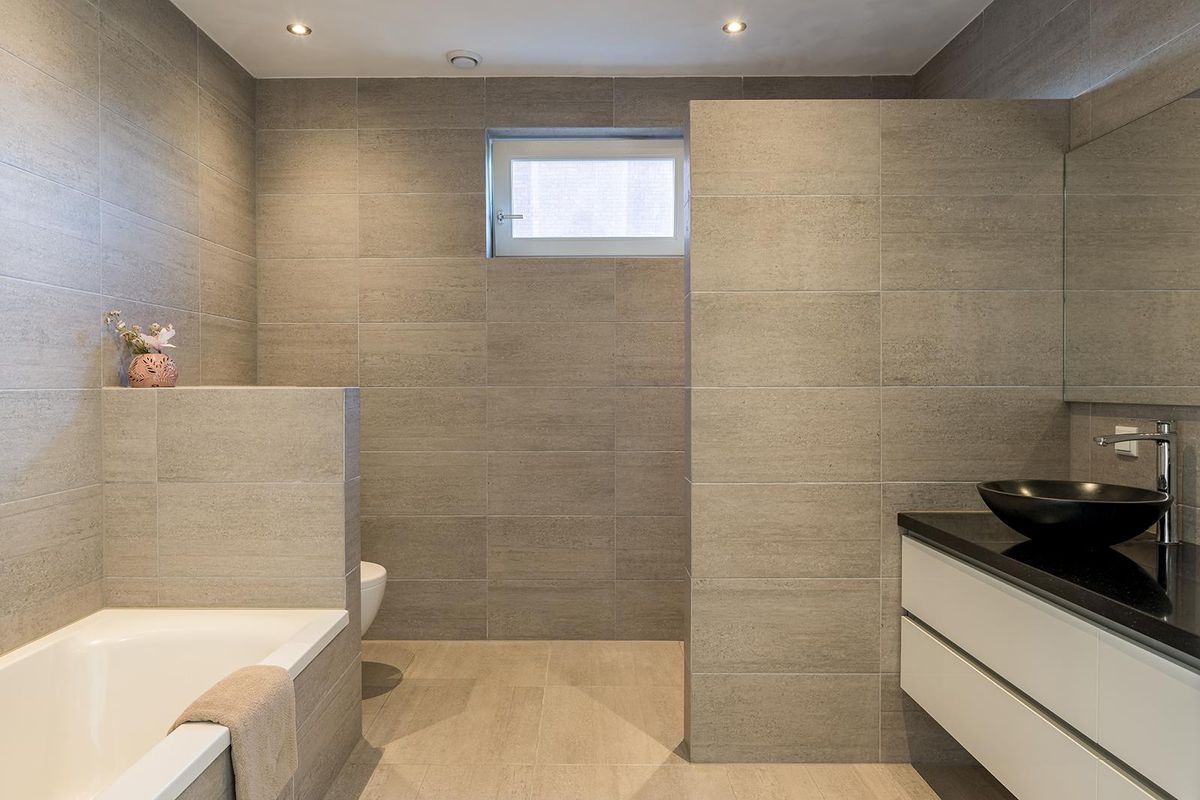 Volledig betegelde royale badkamer met riante inloopdouche, een hoogglans wit badmeubel met zwart granieten blad voorzien van 2 waskommen met meer dan ruim voldoende opbergruimte, een designradiator, vloerverwarming, een ligbad en 2e inbouwcloset.