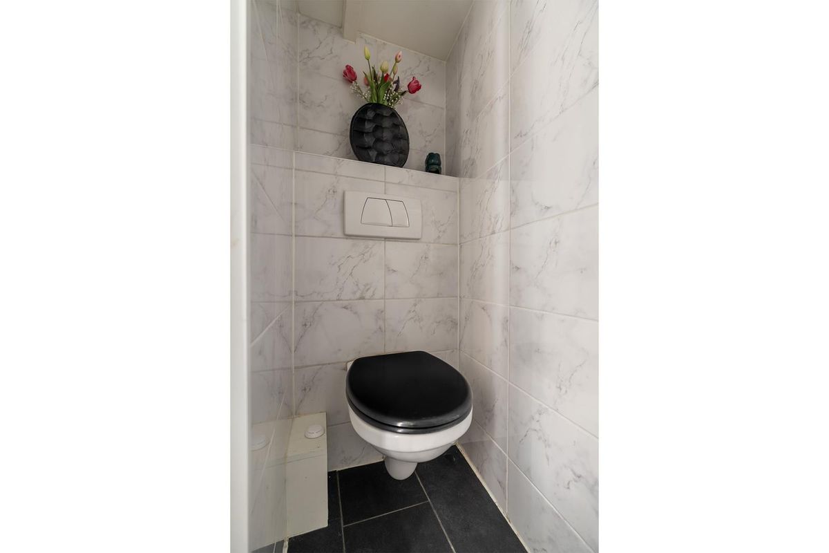 Aansluitend vind je de toiletruimte, uitgevoerd met wit marmerlook wandtegels, antraciet vloertegels en een wandcloset.