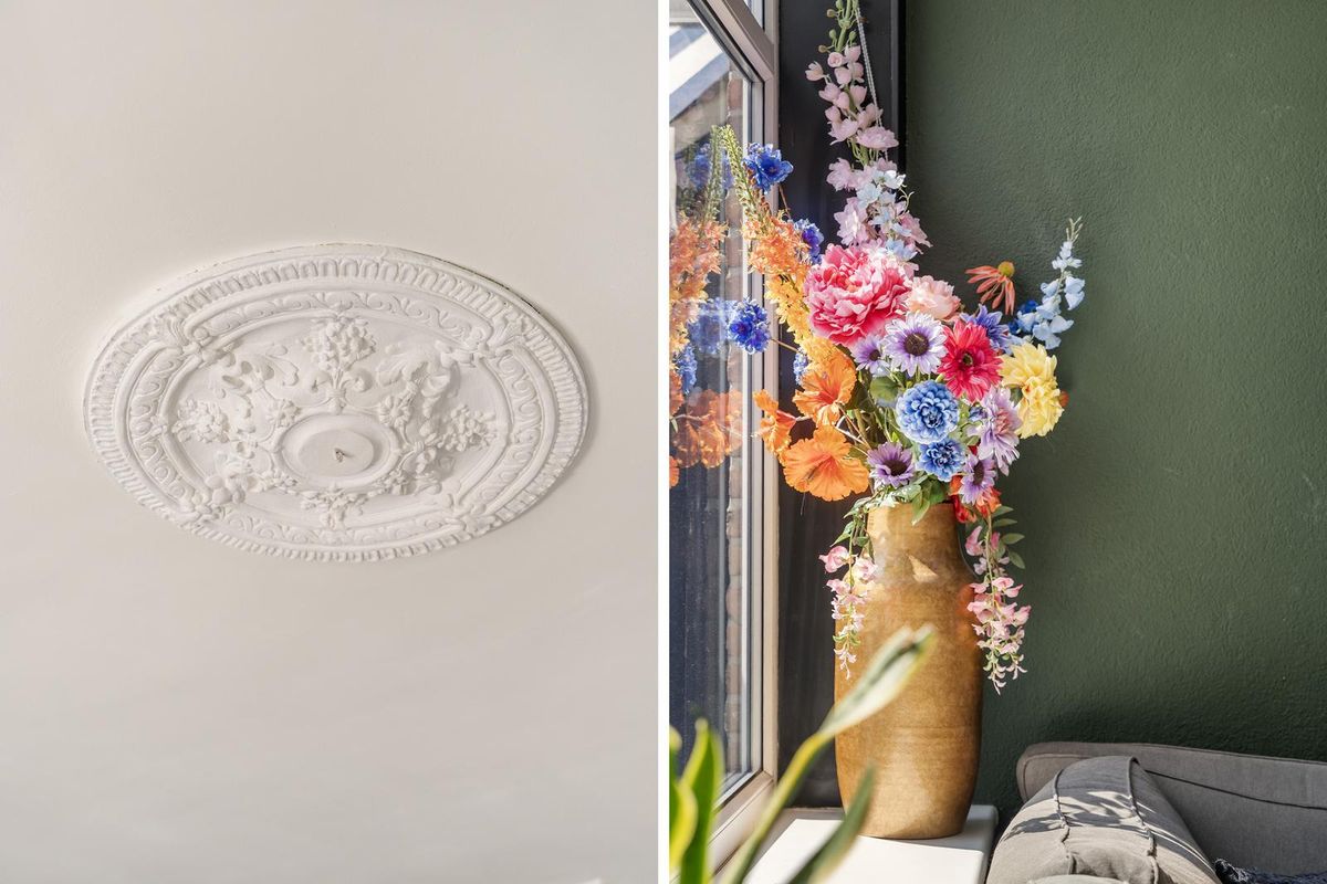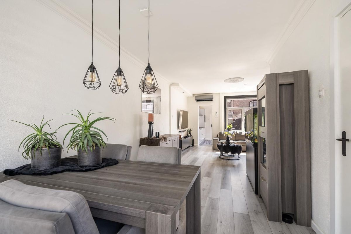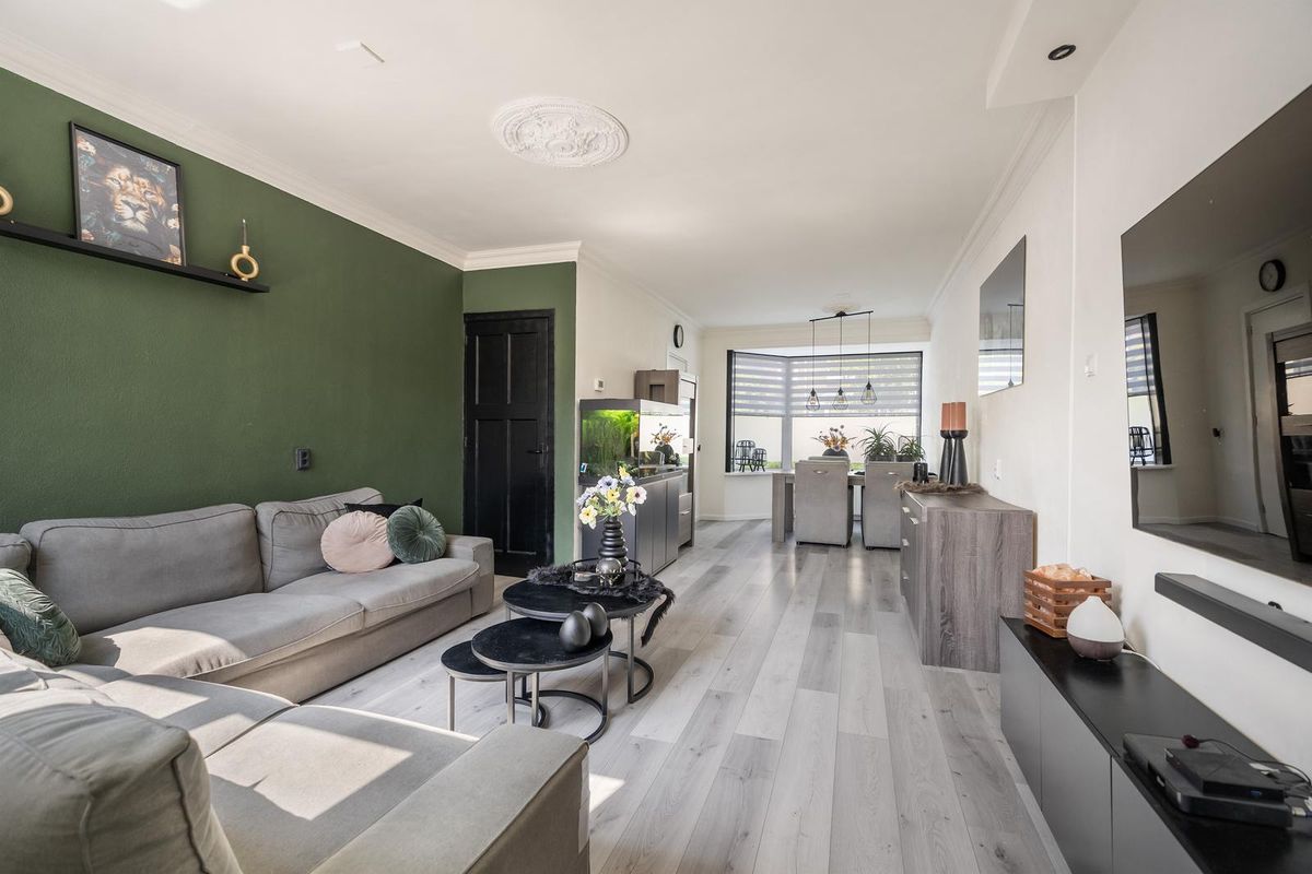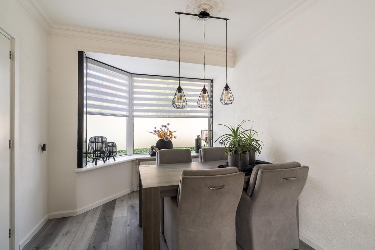 De woonkamer is licht en prettig ingedeeld met een sfeervolle erker aan de voorzijde, een zitgedeelte aan de tuinzijde en een eetgedeelte aan de voorzijde.