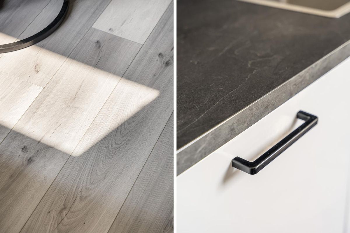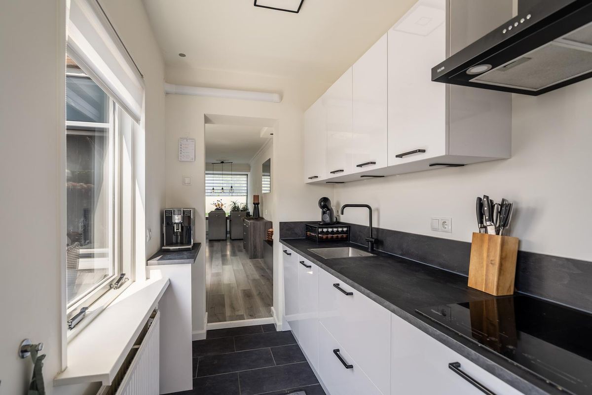 De keuken is bereikbaar via het zitgedeelte en beschikt over een royale wandopstelling in wit hoogglans, met koel-vriescombinatie, inductiekookplaat met RVS afzuigkap, combimagnetron, spoelbak met designkraan en veel bergruimte. Aan de overzijde is een compacte koffiebar ingericht. De donkere kunststof werkbladen en spatranden maken het geheel af.
