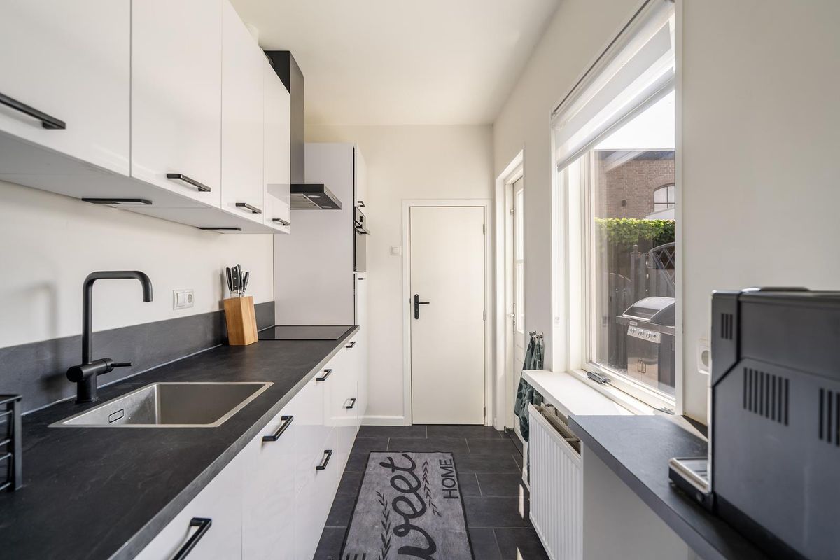 Vanuit de keuken is de verzorgde achtertuin bereikbaar via een deur, inclusief aangebouwde stenen berging en achterom. De achtertuin is netjes betegeld en biedt voldoende ruimte voor verschillende terrassen. De aangebouwde stenen berging en de achterom maken het geheel praktisch en gebruiksvriendelijk.