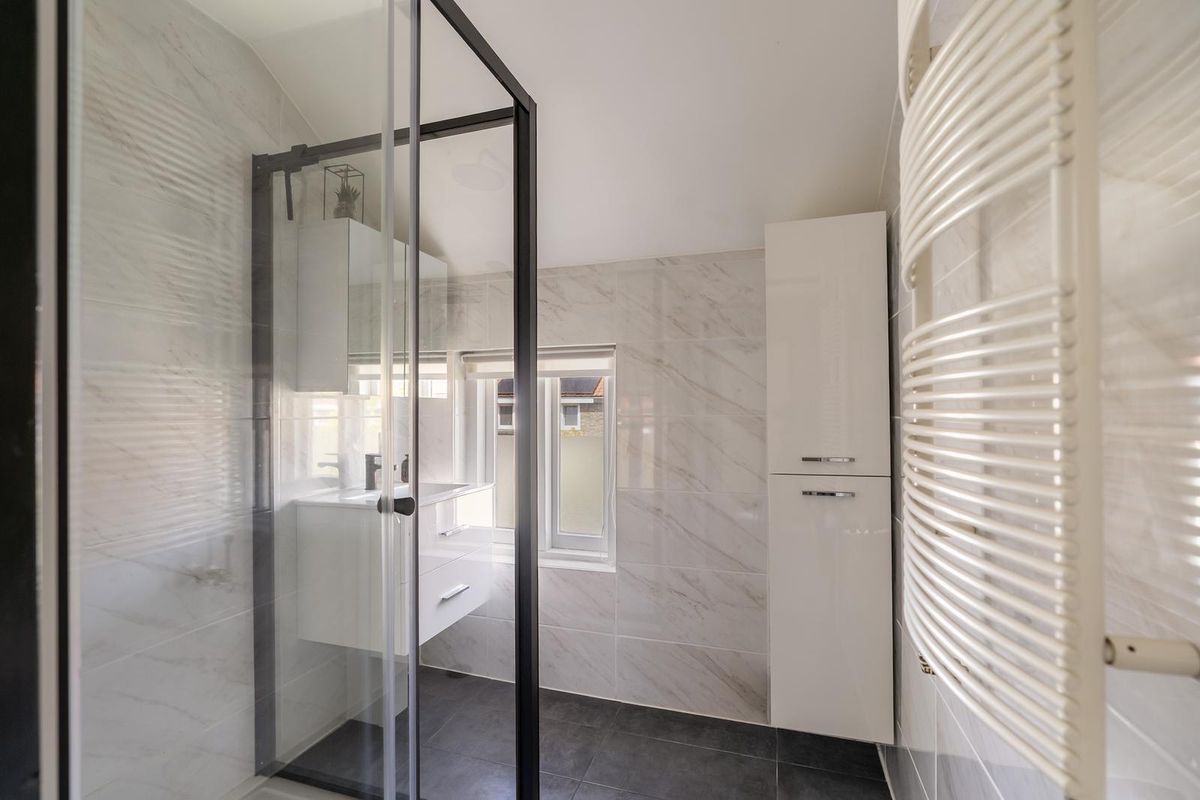 De mooie badkamer is netjes afgewerkt met marmerlook wandtegels en antracietkleur vloertegels, en voorzien van een douchecabine met regen- en handdouche in zwart, een wastafelmeubel met spiegelkast en een designradiator. Het aanwezige raam zorgt voor natuurlijk licht en ventilatie.