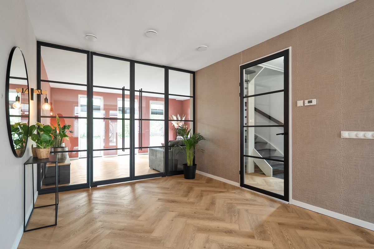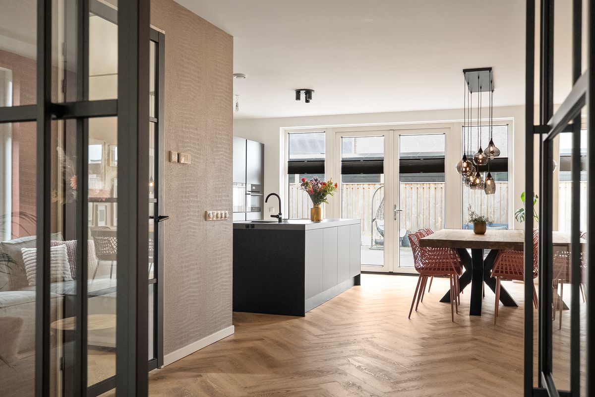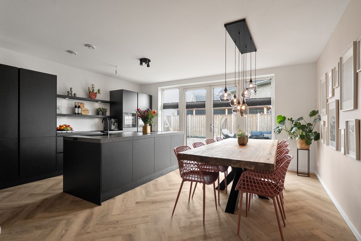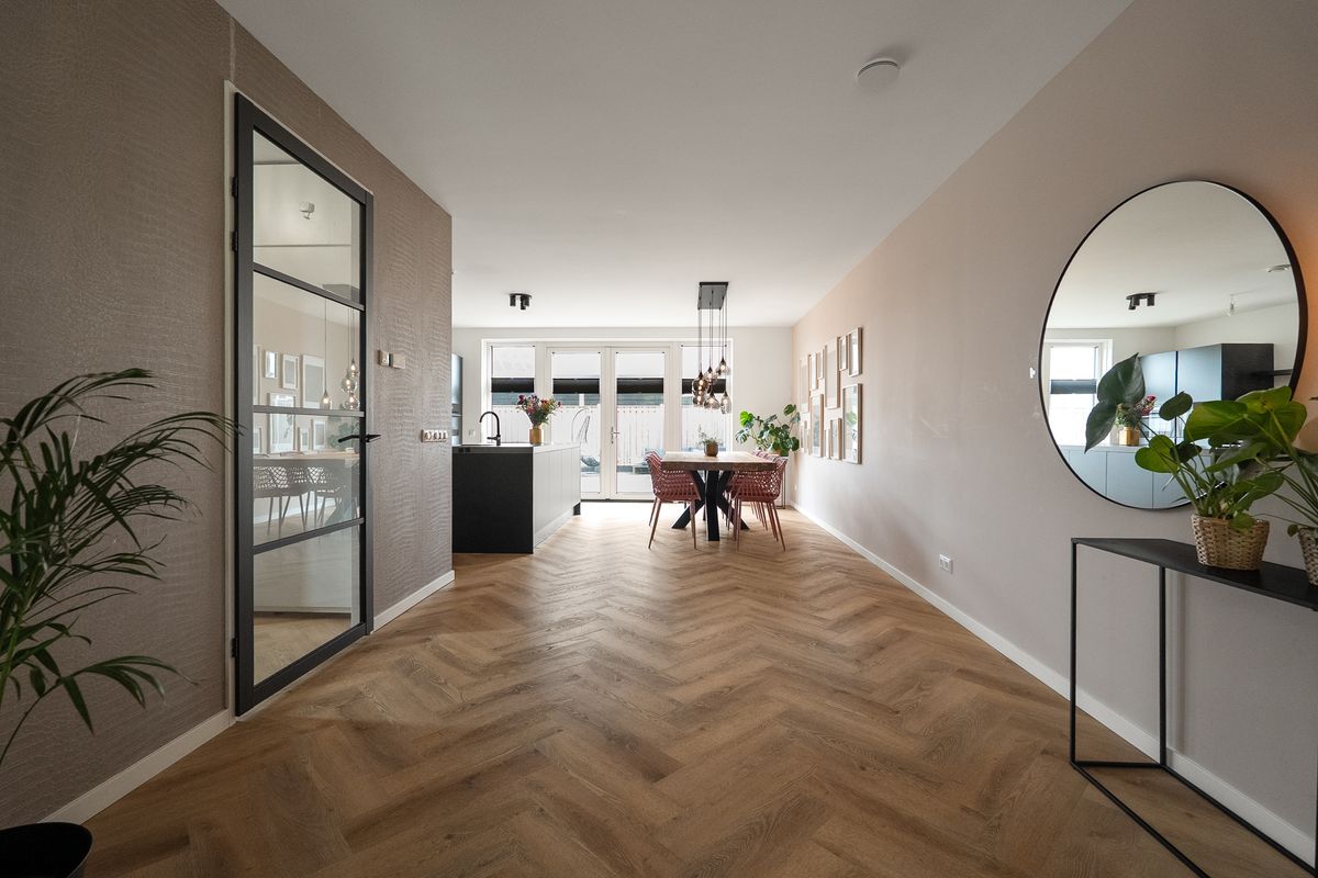 Parkeren op eigen oprit, achterom naar de tuin, entree woning. Entree in de hal met meterkast, toilet en trapopgang naar de verdieping. Vanuit de hal kom je in de royale, uitgebouwde living met aan de voorzijde de zithoek en aan de tuinzijde (voorzien van dubbel openslaande tuindeuren) een riante woonkeuken met kookeiland en al het gewenste inbouwapparatuur. Zithoek en keuken worden van elkaar gescheiden door zwart stalen taatsdeuren. Op de eerste verdieping bereik je vanaf de overloop 3 prima slaapkamers een volledig betegelde badkamer met wastafelmeubel, inloopdouche en tweede toilet. De tweede verdieping biedt een ruime vierde slaapkamer voorzien van een recent geplaatst dakkapel, een zeer ruime overloop (mogelijk vijfde slaapkamer), technische ruimte en verrassend hoge nok waar met gemak nog een bergvliering in gemaakt kan worden.