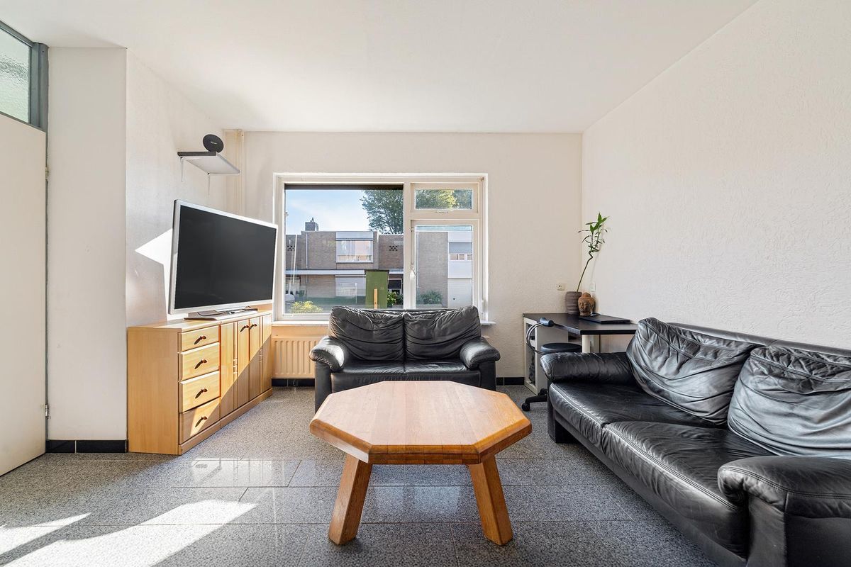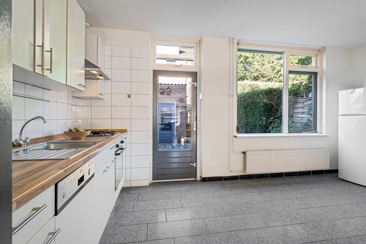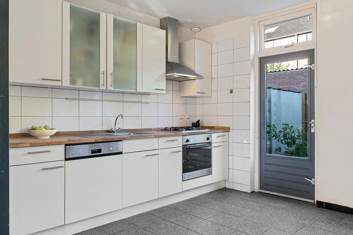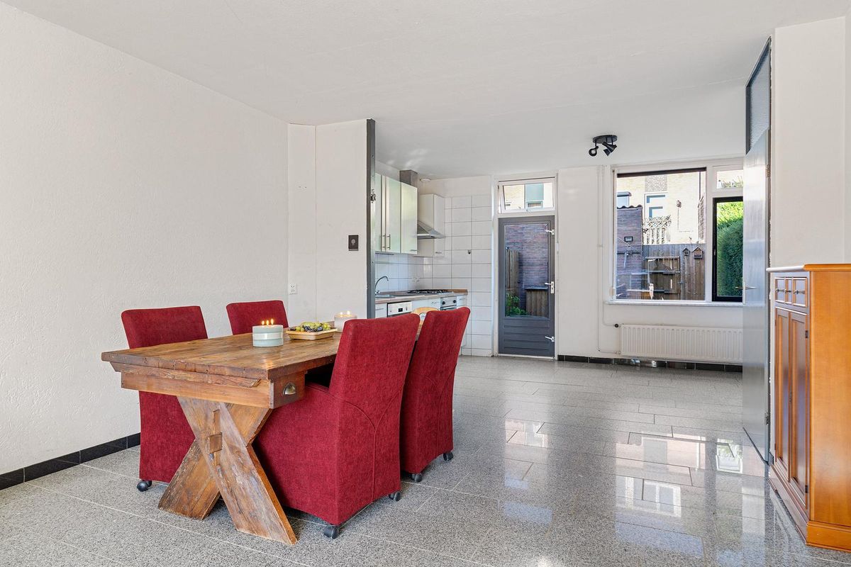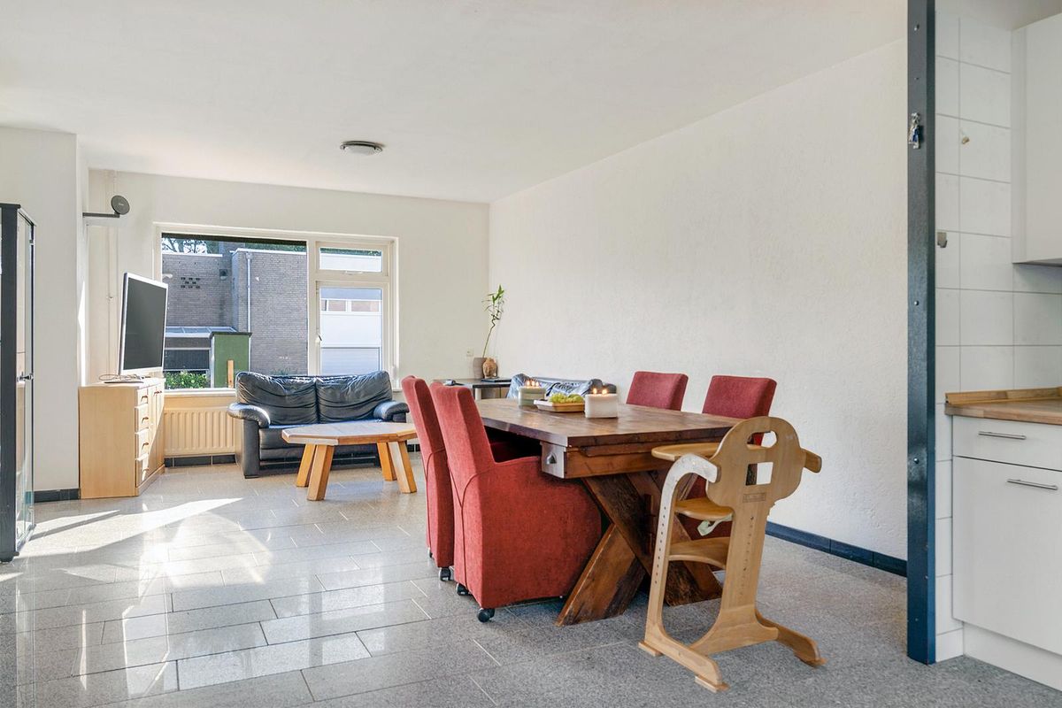 De woonkamer is licht en ruim en biedt voldoende ruimte voor een comfortabele zithoek én eethoek. Vanuit het eetgedeelte is de open keuken toegankelijk. De keuken is royaal van opzet en voorzien van een 4-pits gasfornuis met afzuigkap, oven, vaatwasser, spoelbak met kraan, en diverse boven- en onderkasten. Dankzij de grote raampartij en tuindeur geniet u hier van veel daglicht én direct tuincontact. In de woonkamer bevindt zich een afgesloten trapkast, waarin de trap naar de eerste verdieping is gesitueerd, netjes uit het zicht en ruimtebesparend.