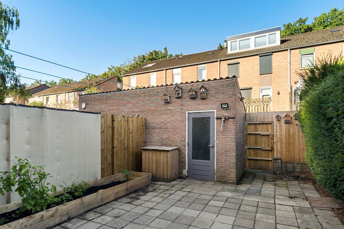 Achter in de tuin bevindt zich een externe berging van circa 6 m², ideaal voor het stallen van fietsen of het opbergen van tuinmateriaal.