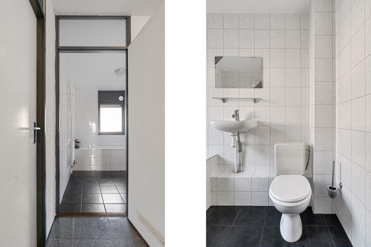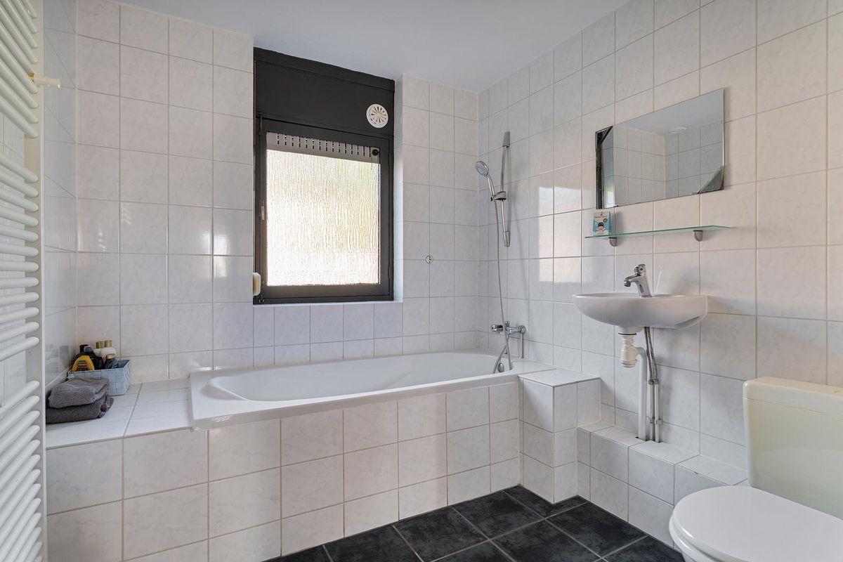 De badkamer is volledig betegeld en beschikt over een ligbad met douche, tweede toilet, wastafel met kraan en een handdoekradiator.