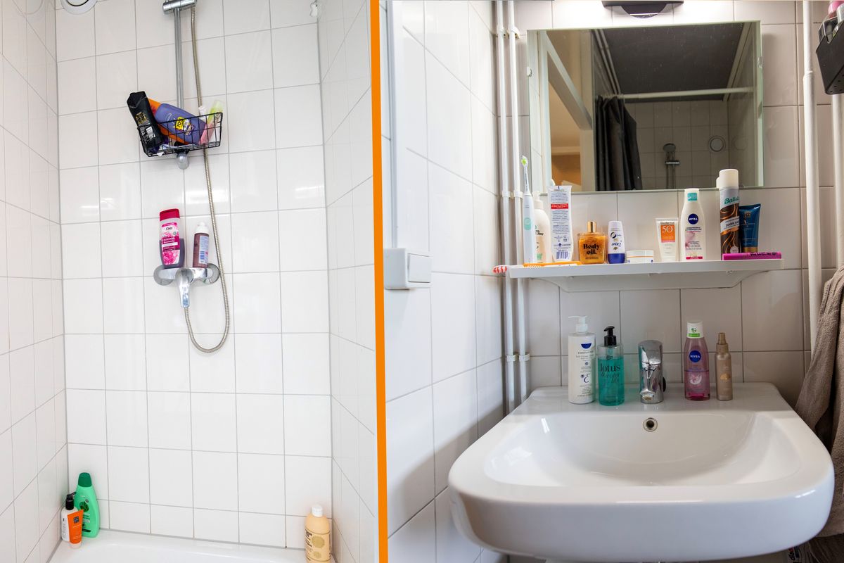 Badkamer met douche en wastafel