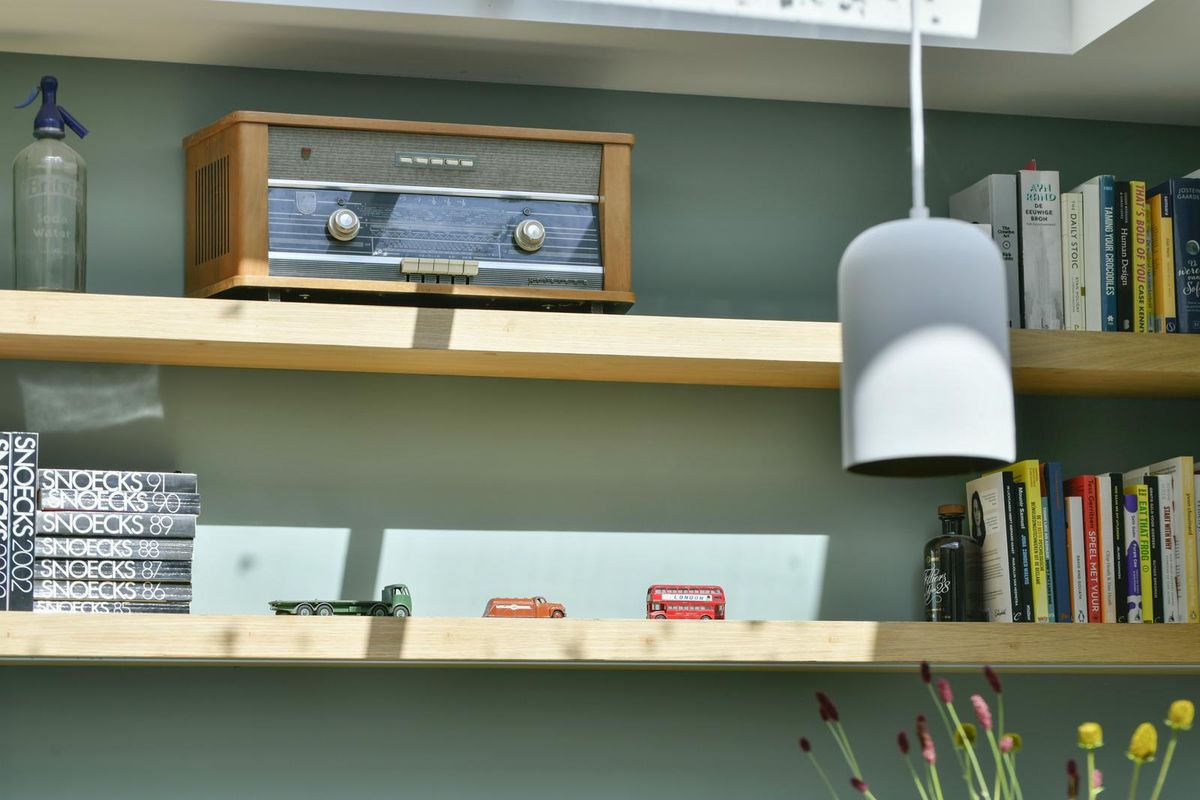 Het keukenblok is voorzien van inbouwapparatuur: 4-pits gasfornuis, afzuigkap, grote oven, magnetron, grote koelkast met losse vriezer en een vaatwasser. Verder zijn er wandcontactdozen centraal geplaatst in de keuken en daarbij heeft de chef werkruimte op het natuurstenen aanrechtblad. Ook zijn er magnetisch strips aan de wand gemonteerd, voor het ophangen van keukenmessen en witte kastjes bieden veel opbergruimte. Naast het keukenblok zijn er overigens ook nog wandplanken en inbouwkasten te vinden, waar bijvoorbeeld de wasmachine handig is weggewerkt.