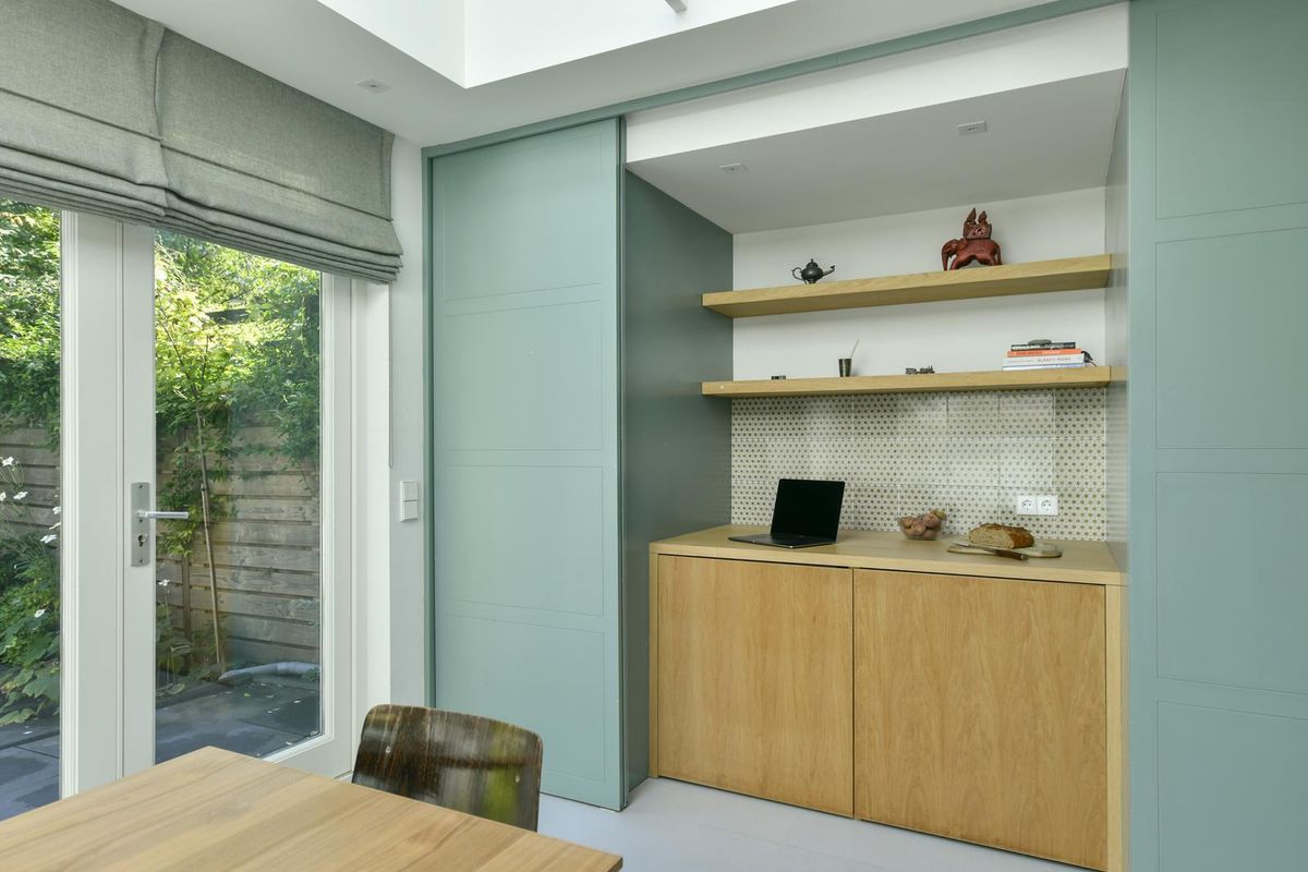 The spacious living room, which you can obviously decorate to your own taste, is located at the front of the house. There is more than enough space for both a sitting area with a large family sofa and coffee table as well as an armchair with (book) cabinets to your own liking. There is also a built-in cupboard in the living room. Large windows provide an unobstructed view of the street and the communal square with a public garden further away. This lovely space is an ideal alternative to the cozy kitchen diner.