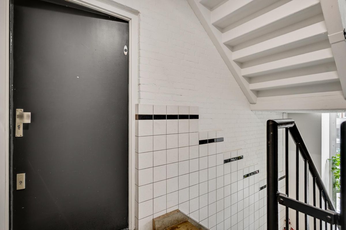 Centrale entree met bellentableau en brievenbussen. Via het trappenhuis zijn zowel het souterrain als het appartement op de tweede verdieping bereikbaar.