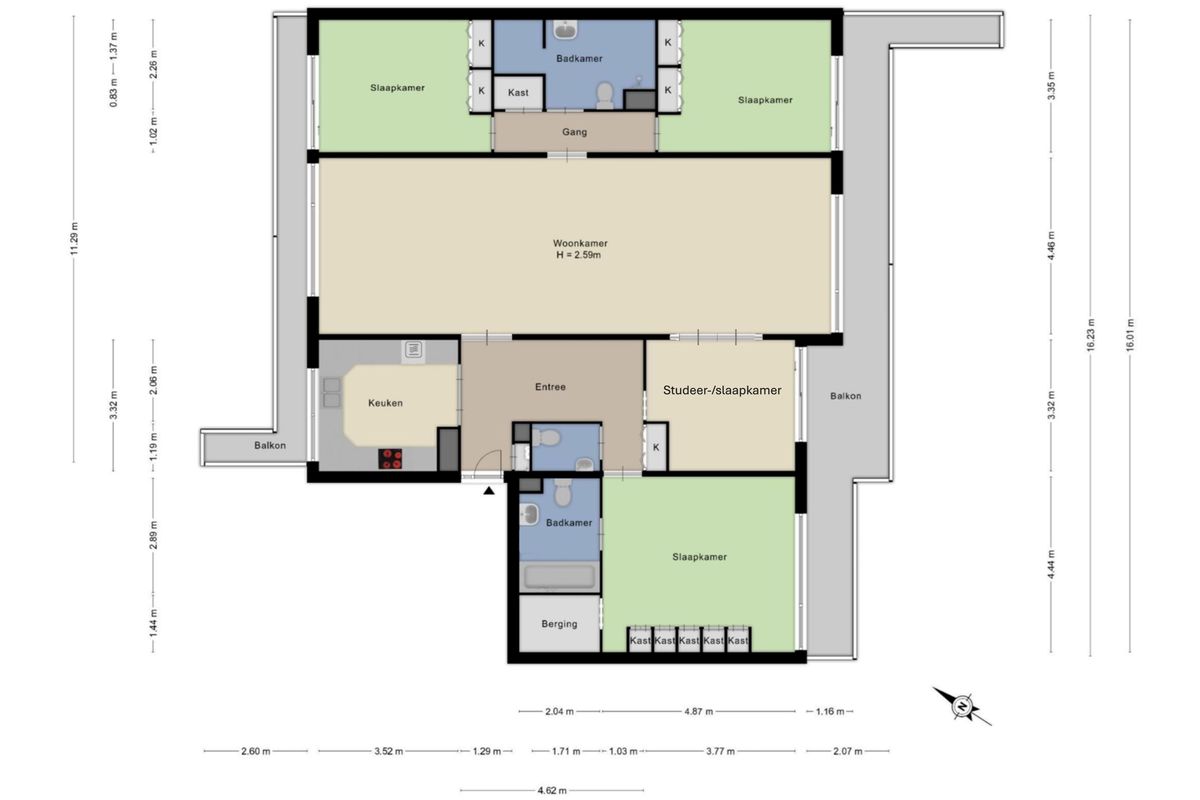 Dit appartement biedt volop leefruimte en comfort. De riante woonkamer is het hart van de woning en sluit naadloos aan op het balkon op het zuidoosten – ideaal voor een kop koffie in de ochtendzon. De moderne keuken is voorzien van inbouwapparatuur en biedt alle gemak voor de kookliefhebber. De drie slaapkamers en aparte studeerkamer maken dit appartement niet alleen geschikt voor wonen, maar ook voor werken aan huis of het ontvangen van gasten.