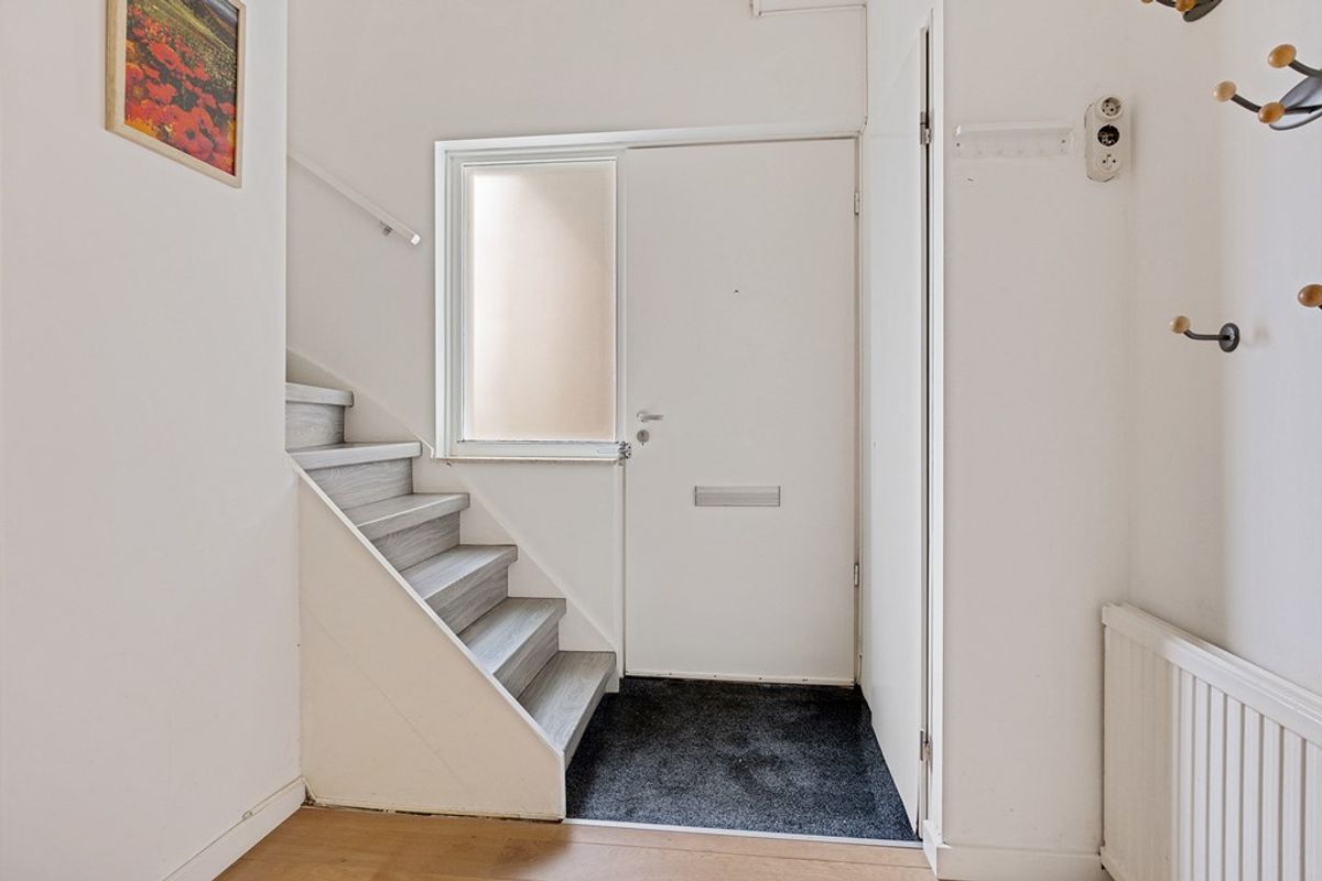 Onder de overkapping vind je aan de rechterkant de entree naar de woning. Je stapt binnen in de hal, waar je links meteen de meterkast ziet. Aan de rechterkant bevinden zich de trap en het toilet naar boven.