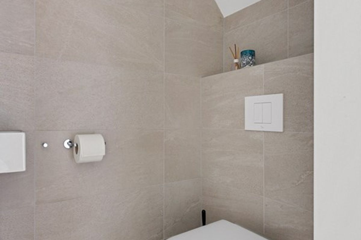 Walking straight ahead, you enter the very spacious living room, with ample space for a comfortable seating area as well as a large dining table. At the rear is the open-plan kitchen, practically laid out and equipped with a dishwasher, fridge, gas hob, oven, sink with tap, and extractor. From the kitchen you also have direct access to the garden—ideal for summer dinners, children going in and out, or simply enjoying a coffee outside.