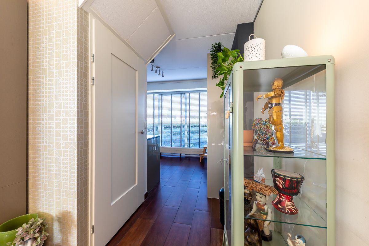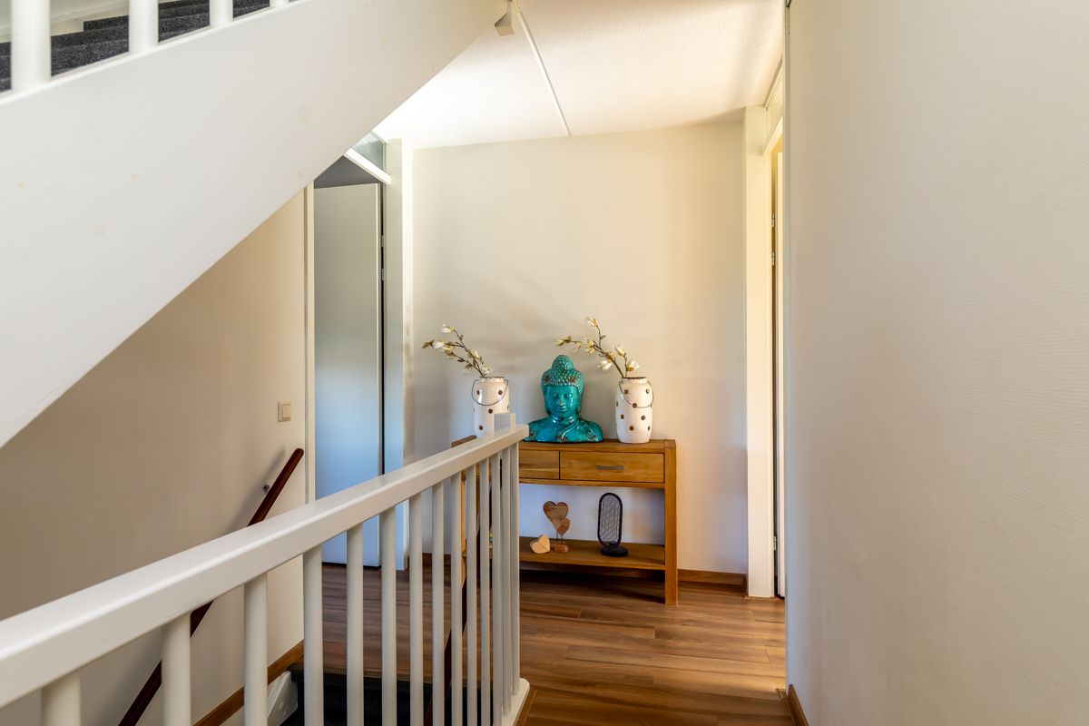 Bij binnenkomst in de ruime hal tref je de meterkast, het toilet en de trapopgang naar de eerste verdieping.