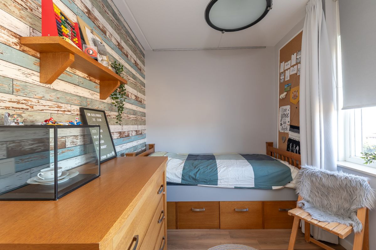 Hier vind je een vierde slaapkamer met airconditioning, veel vaste kastruimte en ook een afgeschermde ruimte met de witgoedaansluitingen.