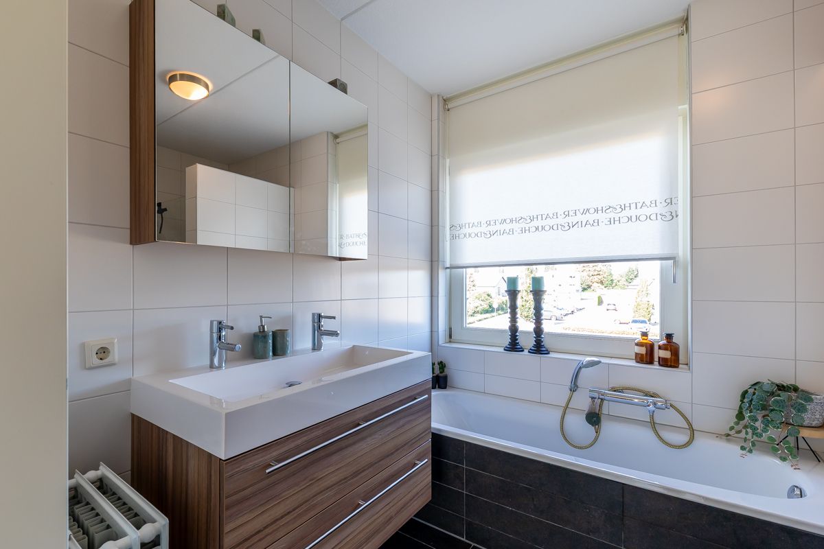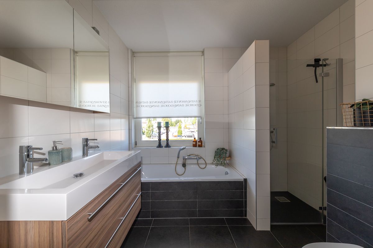 De complete badkamer beschikt over een ligbad, douche, wastafel, toilet en mechanische ventilatie.