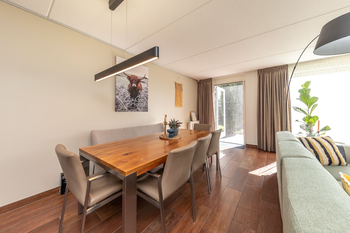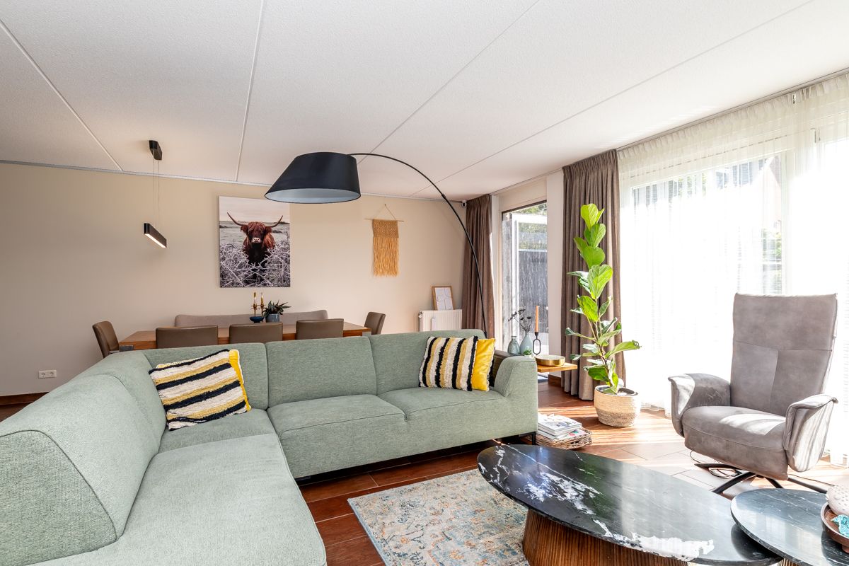 Vanuit de woonkamer stap je via de schuifpui of achterdeur direct naar buiten.