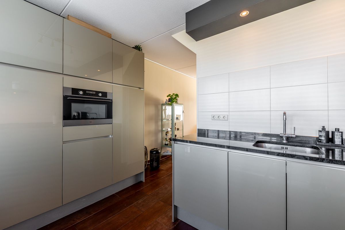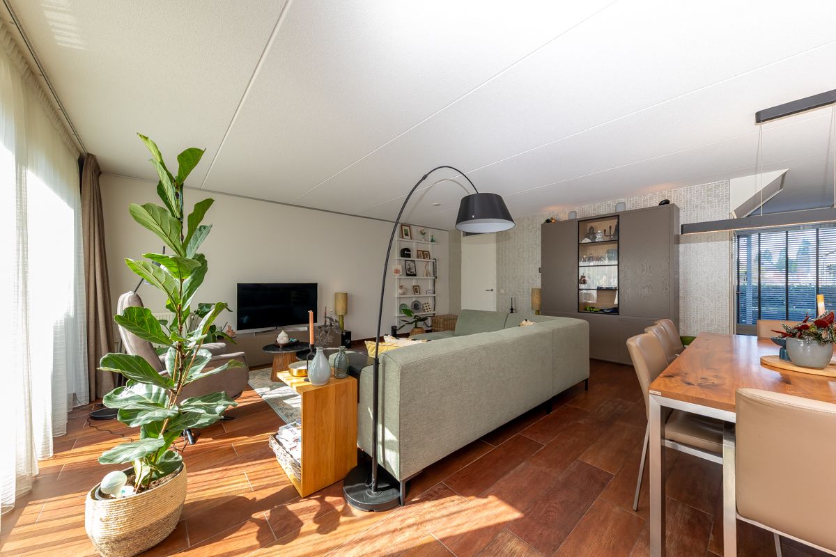 Vanuit hier stap je de lichte en ruime woonkamer binnen, voorzien van vloerverwarming en een schuifpui naar de tuin.