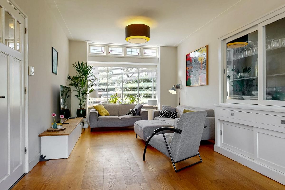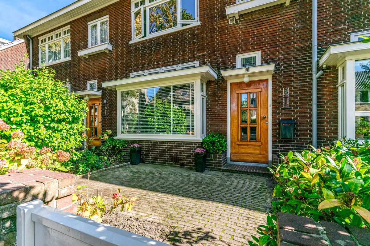 De voorgevel van deze woning ademt de typische kenmerken van de Amsterdamse School: het gebruik van rode baksteen, de verfijnde metselverbanden en de horizontale accenten in de kozijnen geven de woning een uitgesproken en tijdloos karakter. De forse houten voordeur, omlijst door zorgvuldig vormgegeven glas-in-loodramen, vormt een uitnodigend middelpunt en benadrukt de ambachtelijke bouwstijl. Ook binnen zijn diverse originele stijlelementen behouden, wat zorgt voor een warme, authentieke uitstraling.