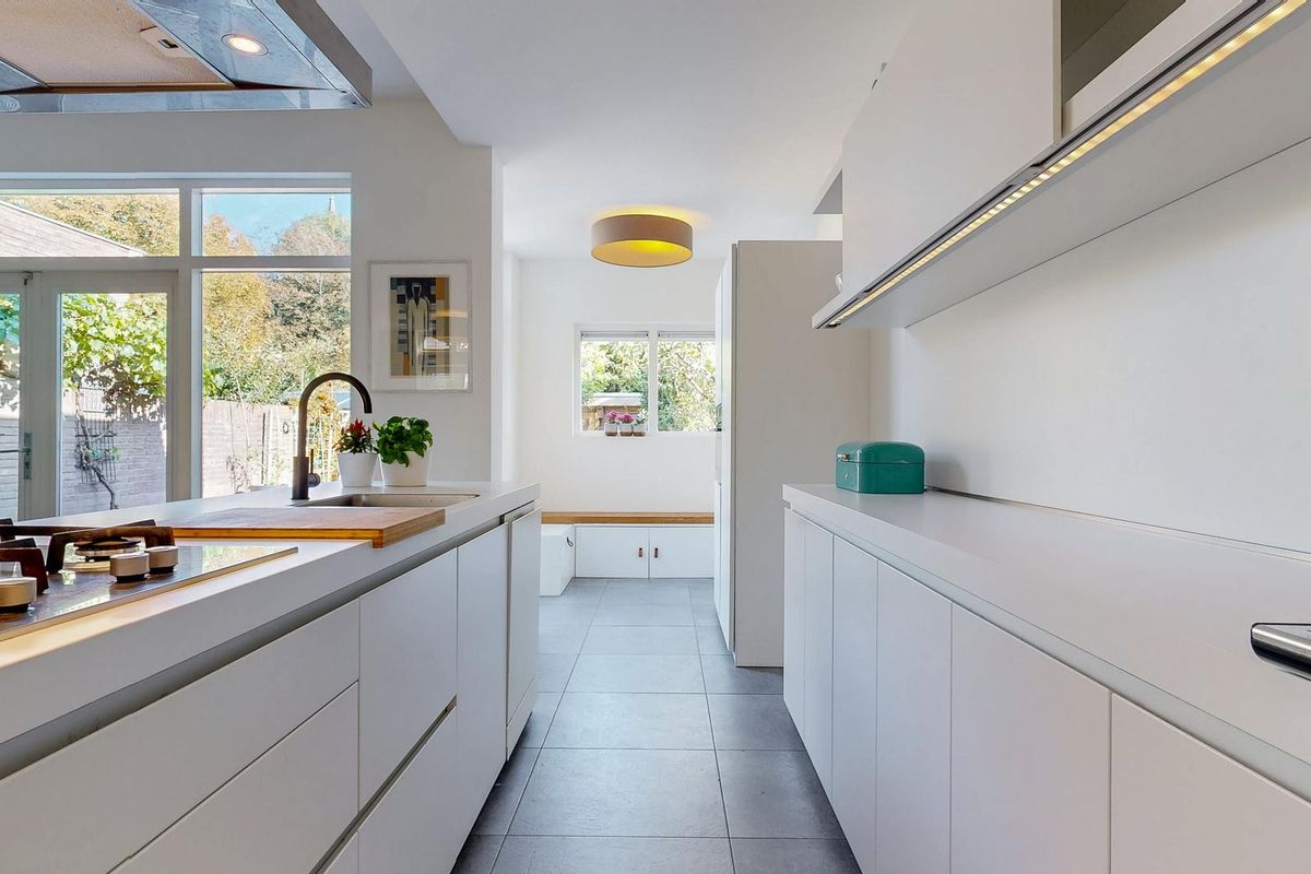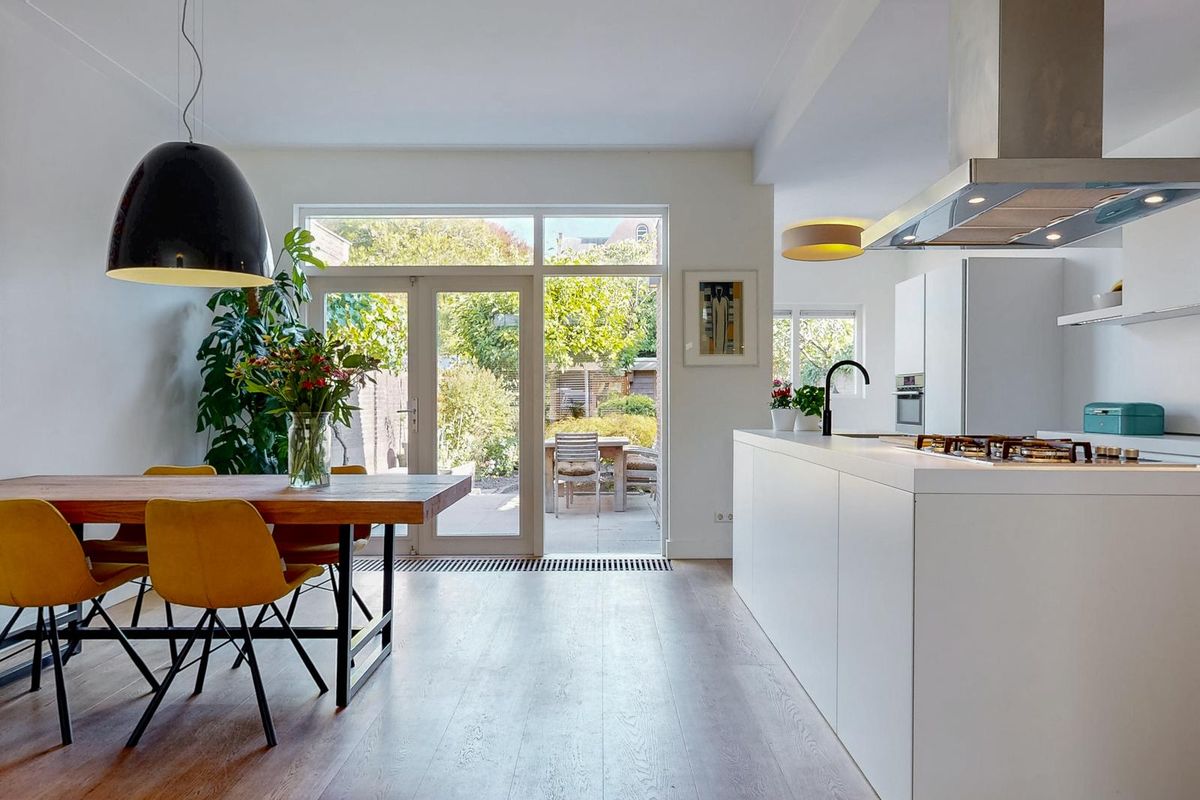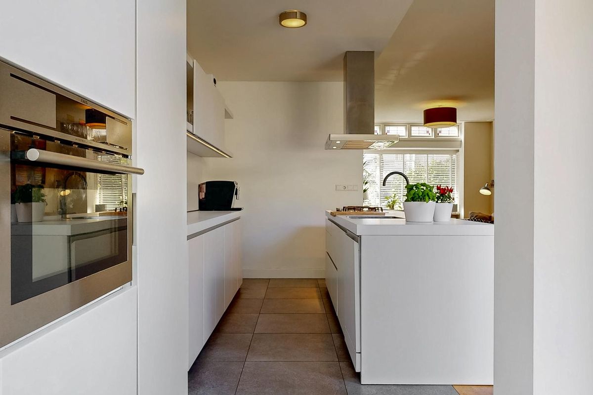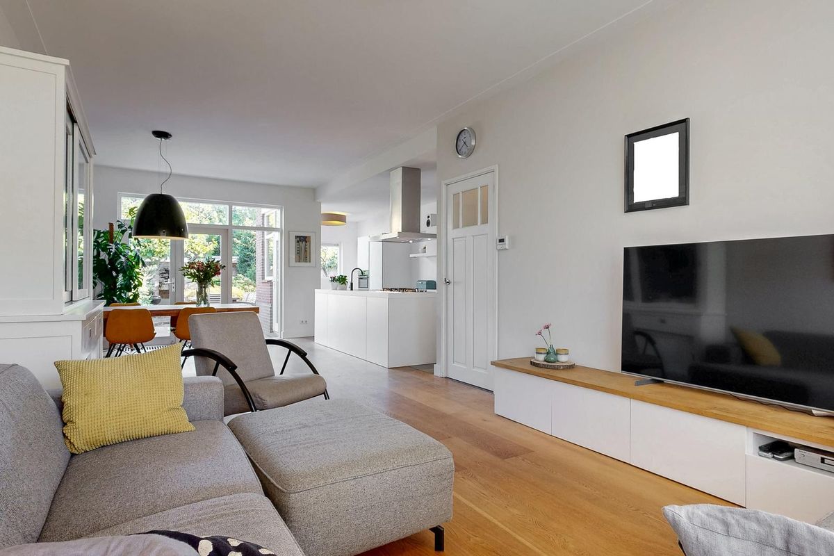 Bij binnenkomst ervaart u direct de royale lichtinval dankzij de grote raampartijen en de open indeling. De woonkamer is een sfeervolle plek waar de hoge plafonds en de houten vloer bijdragen aan een ruimtelijk gevoel. De moderne Bulthaup keuken is een ware eyecatcher: strak vormgegeven, voorzien van hoogwaardige inbouwapparatuur en met een groot kookeiland dat uitnodigt tot samen koken en genieten. Het is een perfecte balans tussen modern comfort en klassieke elegantie.