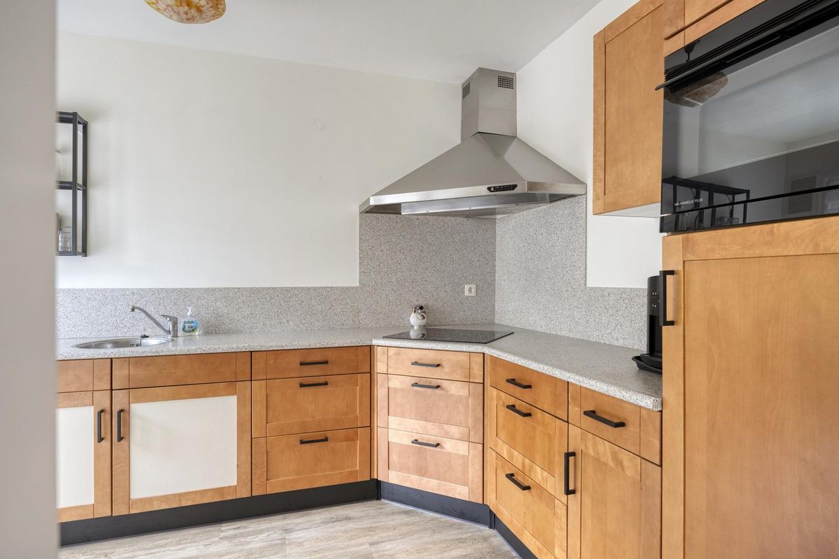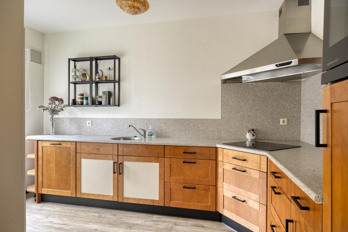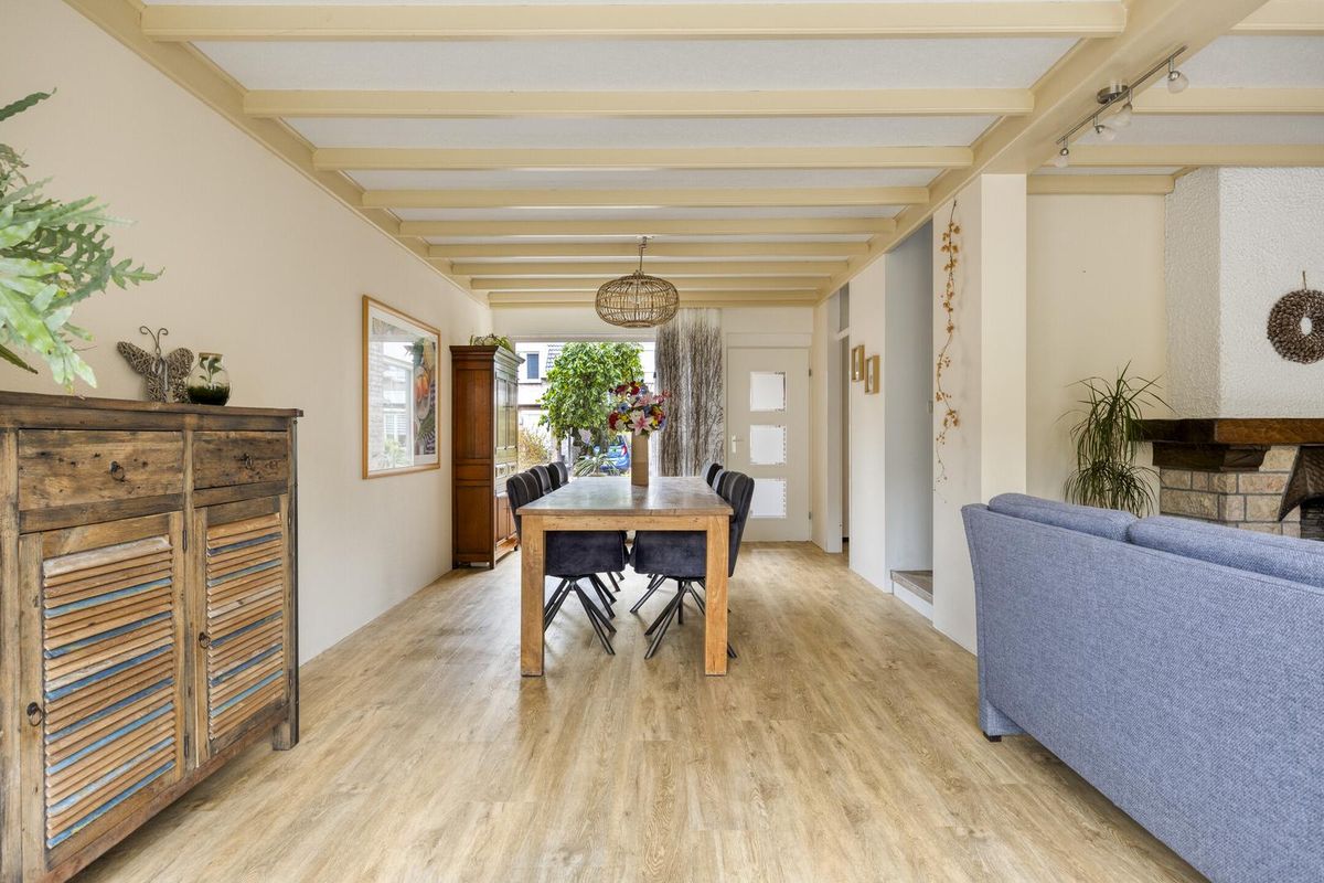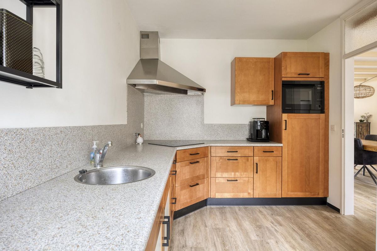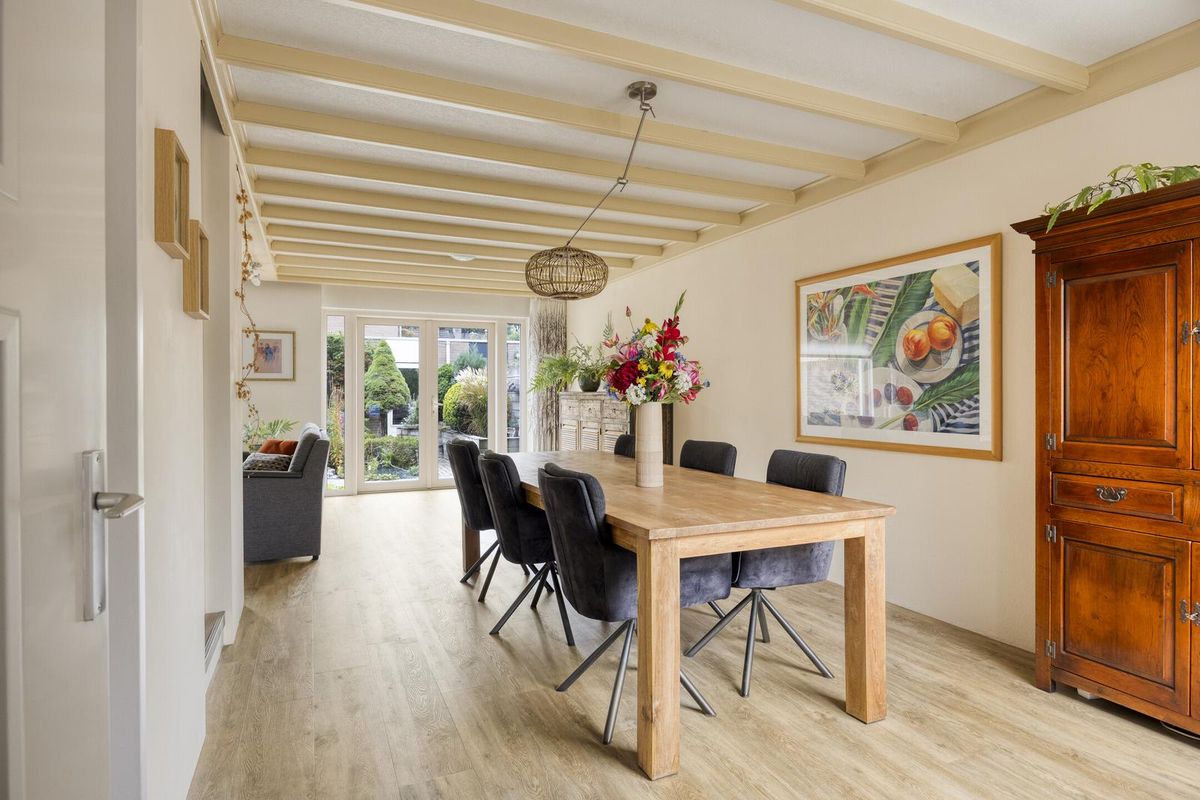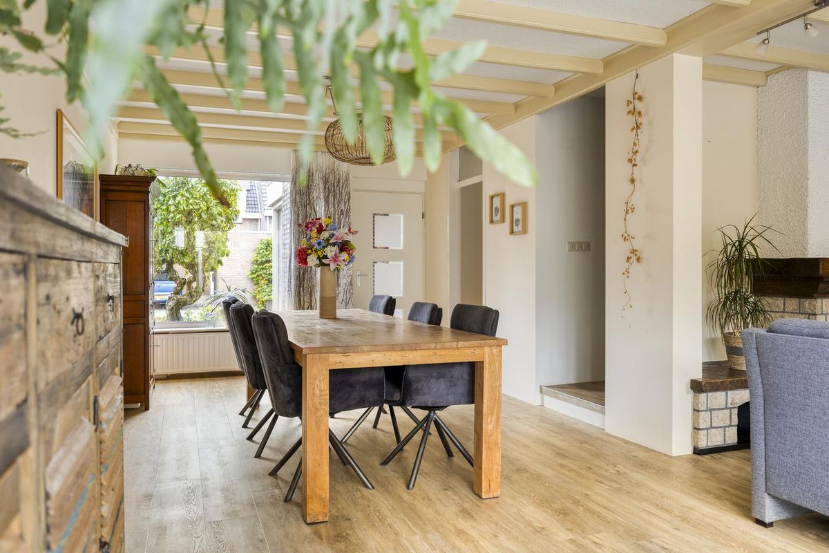 Bij binnenkomst in de woonkamer kom je eerst in het eetgedeelte, met veel lichtinval dankzij een groot raam aan de voorzijde. Hier is ruimte voor een grote eettafel waar je met gemak met zes personen kunt tafelen. Aan de achterzijde vind je het gezellige zitgedeelte met open haard en uitzicht op de tuin. De openslaande deuren verbinden binnen met buiten op een fijne manier. Daarnaast is er nog voldoende ruimte voor een kast of serviesmeubel. Via een kleine doorgang aan de zijkant kom je bij de trap naar boven. De gesloten keuken ligt aan de voorzijde en is uitgevoerd in een hoekopstelling met houten kastjes en zwarte grepen. Voorzien van alle gemakken: een kookplaat, afzuigkap, combi-oven, koelkast en vaatwasser.