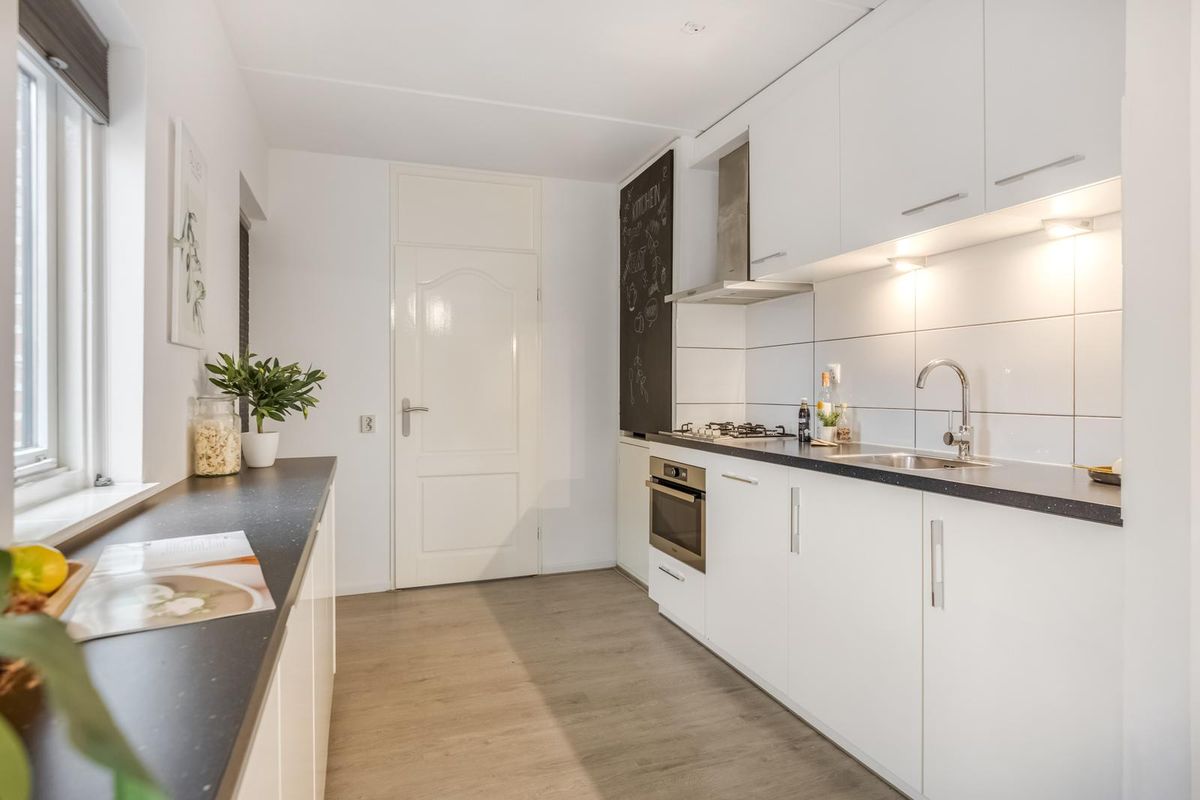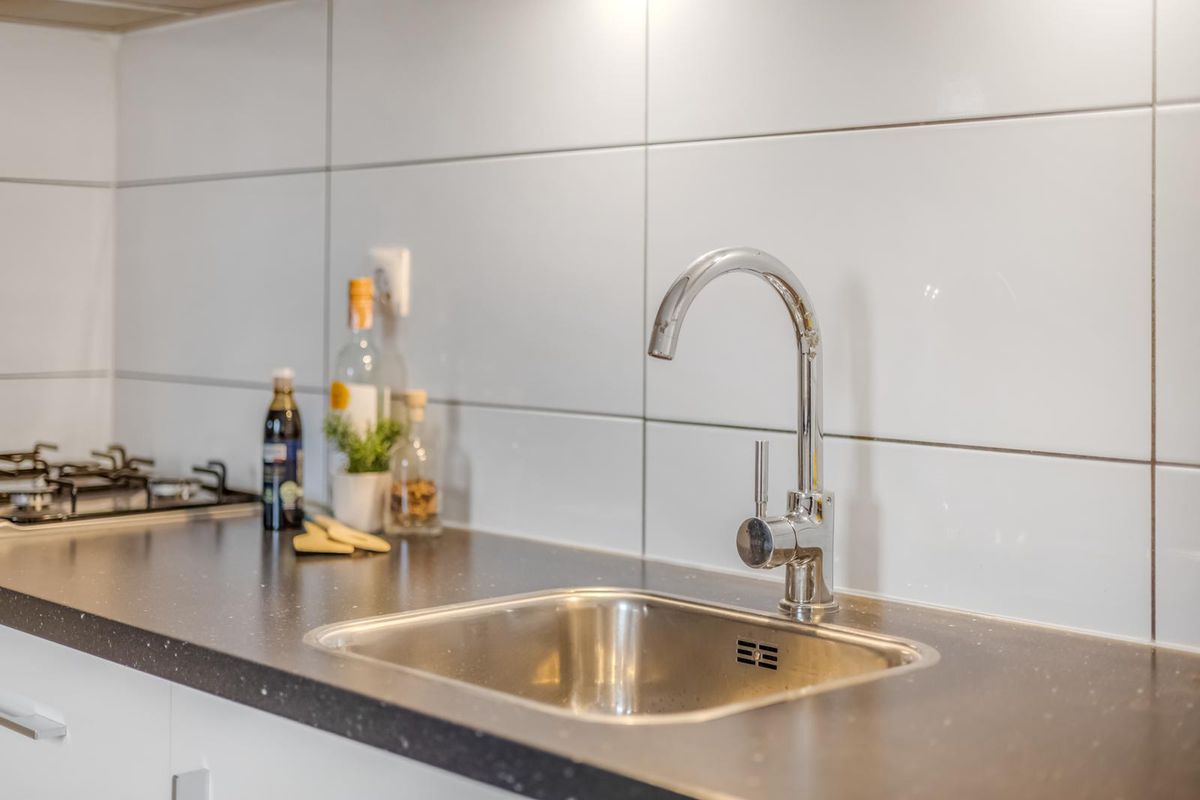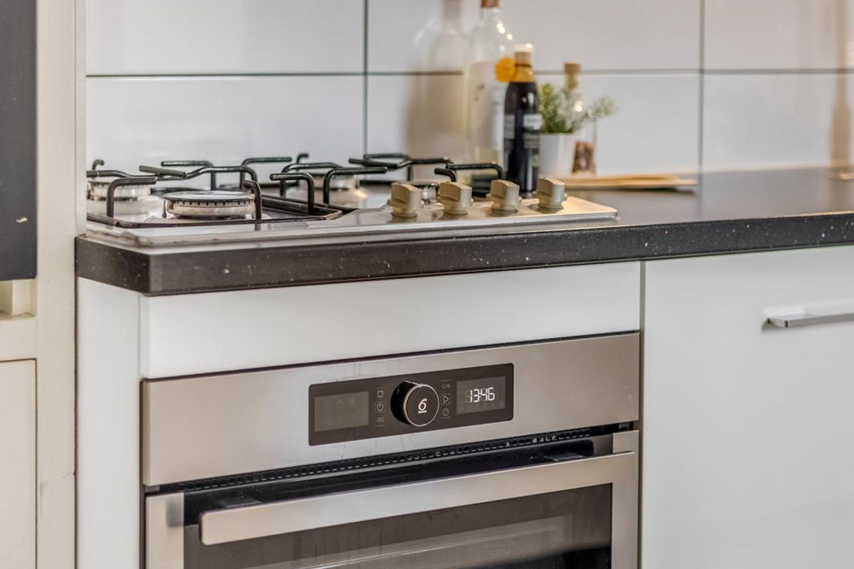 De keuken is strak, wit en praktisch ingedeeld. Alles zit erin wat je nodig hebt: een oven, gaskookplaat, afzuigkap en genoeg opbergruimte. En omdat ‘ie open is, kook je gewoon door terwijl je kletst met je gasten of een serie meepikt vanaf de bank. Wel zo gezellig.