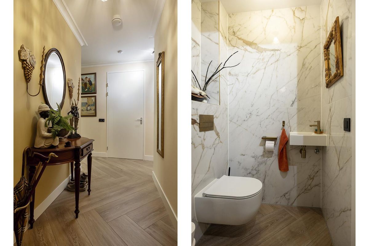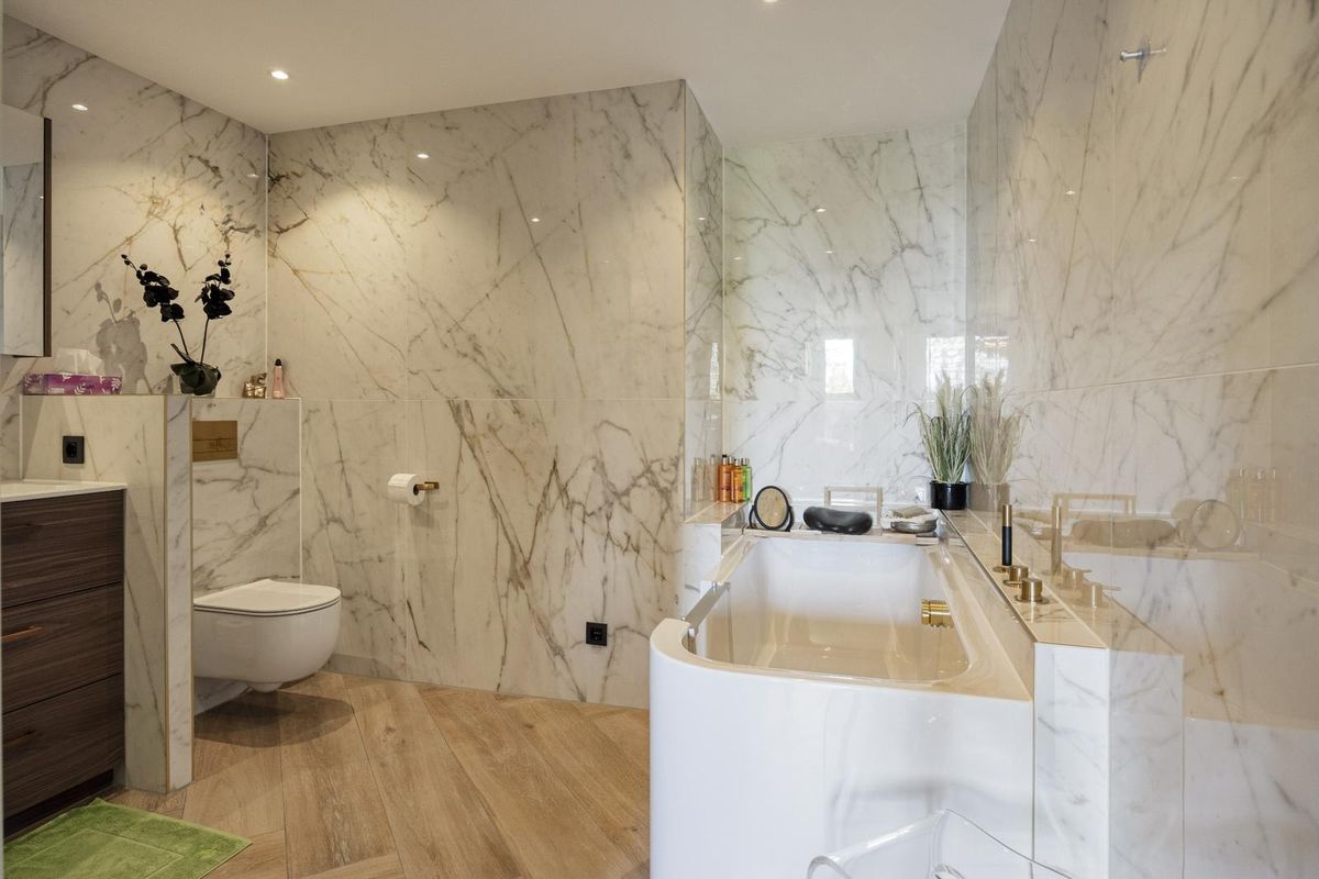 De badkamer sluit naadloos aan op de master bedroom en is ingericht als een moderne wellnessruimte, waar comfort en maatwerk wederom samenkomen. Het op maat gemaakte dubbele wastafelmeubel is voorzien van spiegelkasten die niet alleen extra opbergruimte bieden, maar ook zorgen voor een strakke, symmetrische uitstraling. In de ruimte bevindt zich het stijlvolle instap-ligbad, ideaal voor een ontspannen moment na een lange dag. Daarnaast is er een royale inloopdouche, uitgerust met zowel een regendouche als een geïntegreerde Sunshower, voor een weldadige combinatie van warmte en lichttherapie. Het wandcloset is subtiel ingebouwd. Voor een extra luxe beleving zijn er zelfs speakers geïntegreerd, zodat u kunt genieten van uw favoriete muziek of een rustgevende playlist.